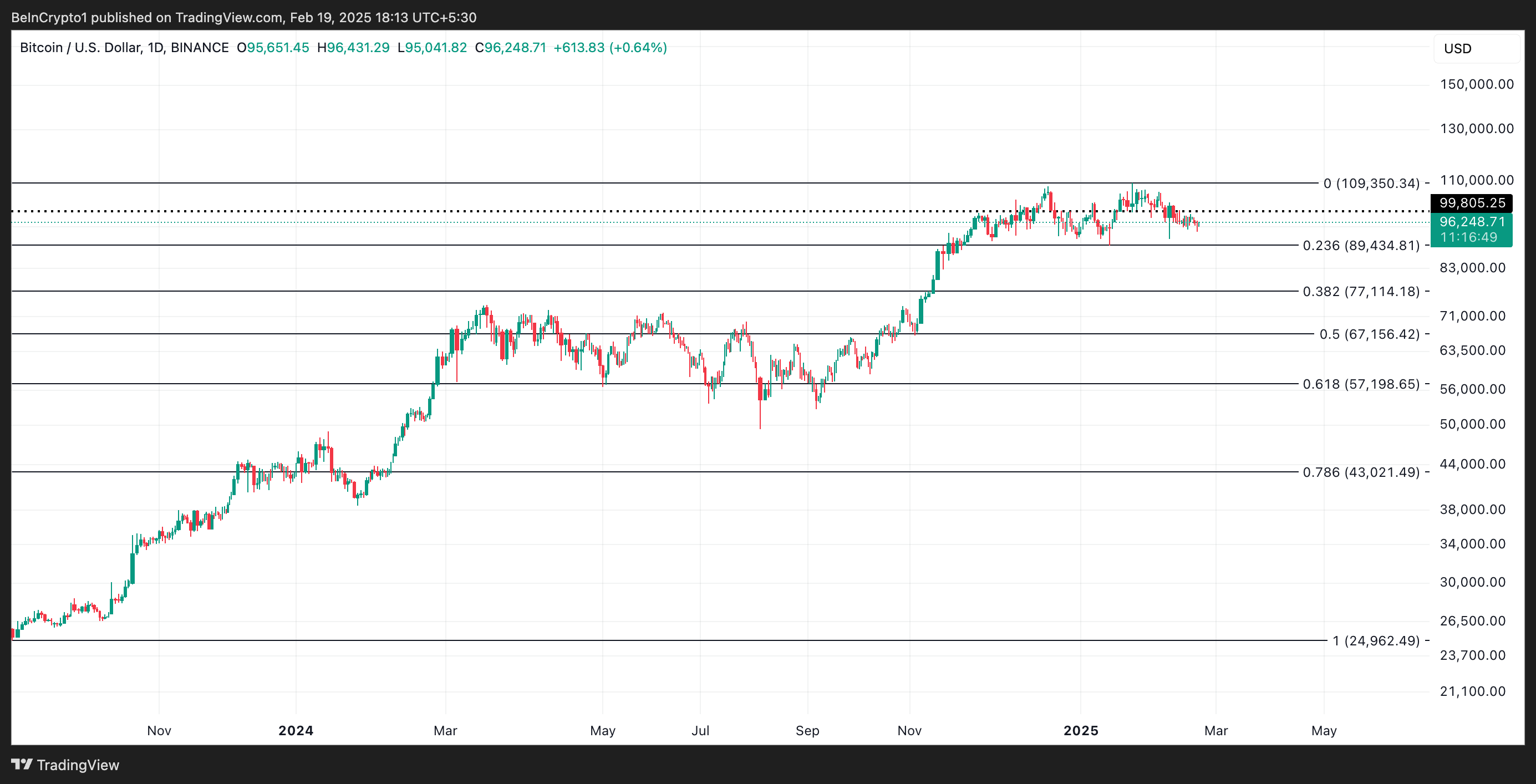 興味深いことに、市場がこの節目を記念する中、ビットコインの価格パフォーマンスは冴えず、依然として10万ドルを下回っている。2月初めから強気と弱気の圧力が相対的に均衡し、コインは狭い範囲内で取引されている。