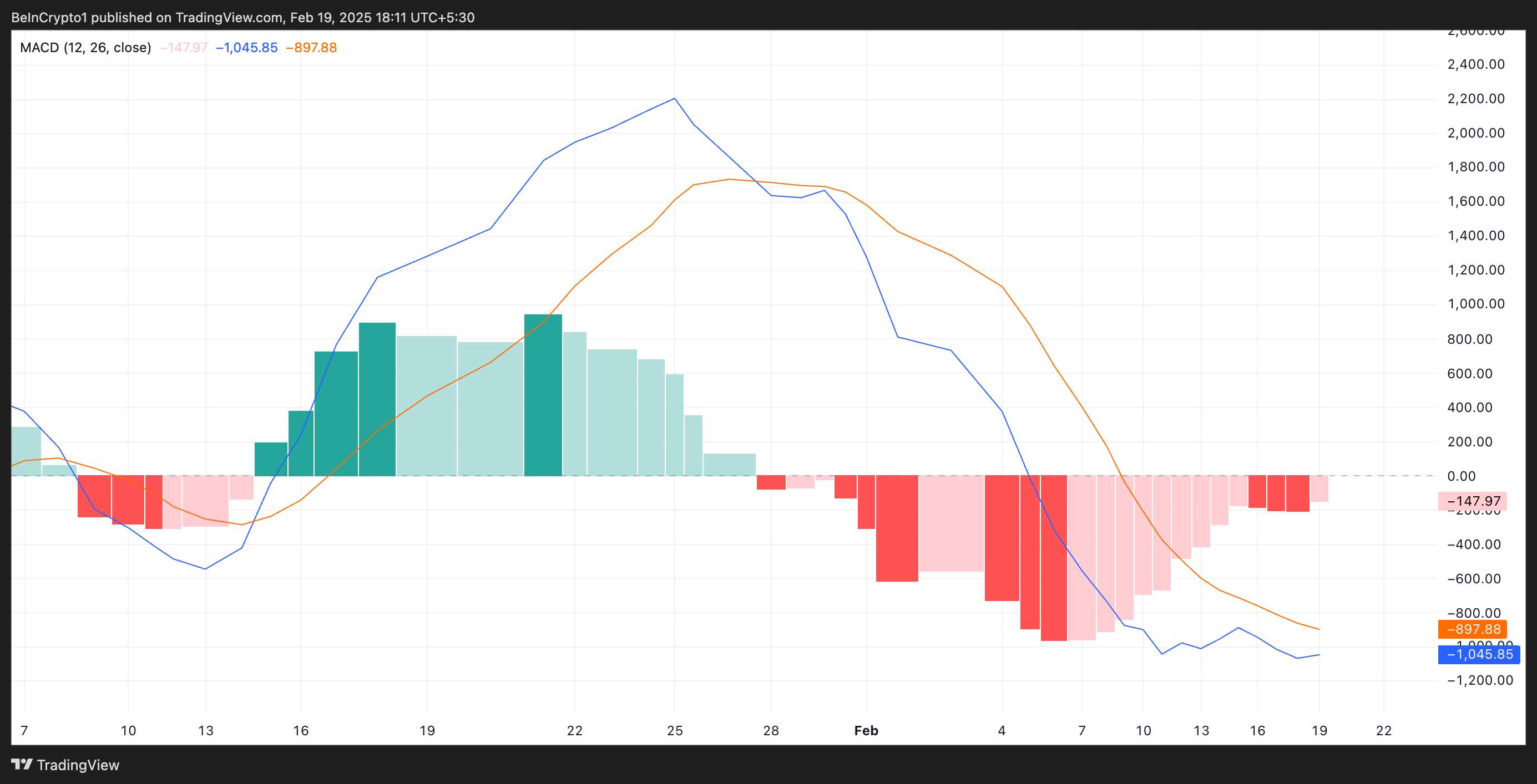 Sponsoredさらに、コインの移動平均収束拡散(MACD)の設定は、この弱気の見通しを支持している。執筆時点で、BTCのMACDライン(青)はシグナルライン(オレンジ)の下に位置している。