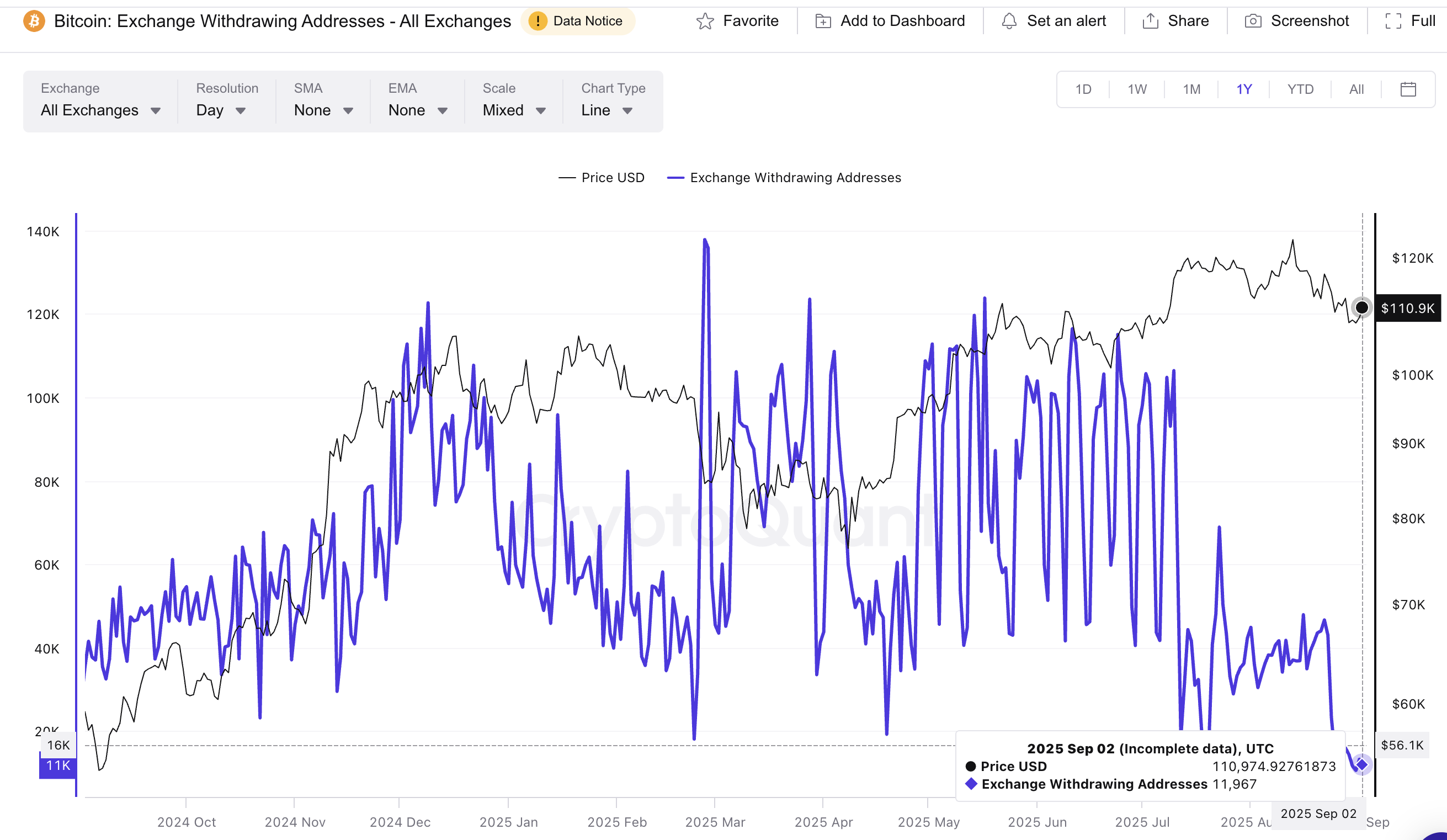 一見するとビットコインの蓄積需要は弱いが、2025年9月に予想される利下げなどポジティブ要因があれば価格上昇の余地はある。ビットコインは9月においてイーサリアムよりETF流入が強い歴史があり、引き出しアドレスの少なさは弱点ではなく、むしろ新たな需要を迎える準備段階とみることもできる。