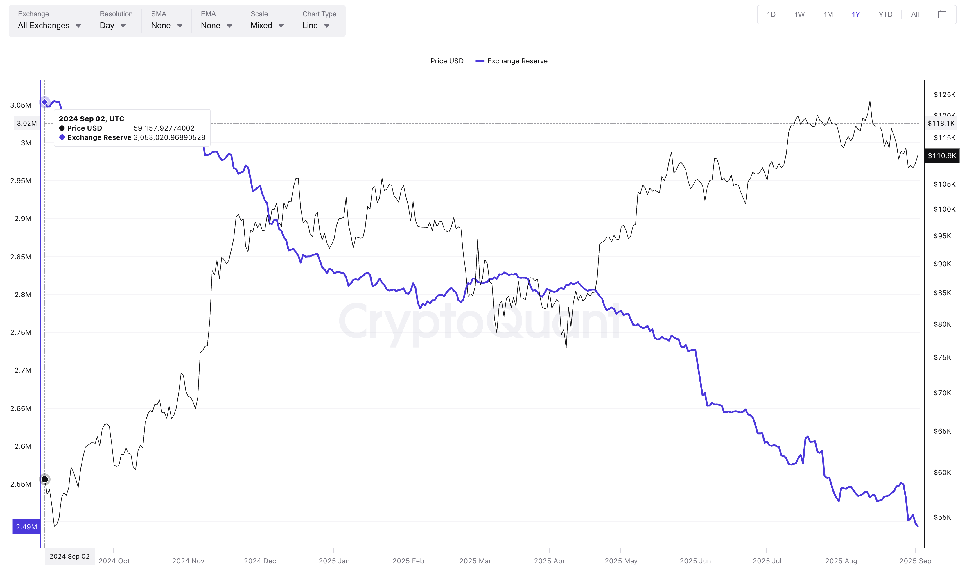 ビットコインの取引所準備金は前年9月から約18.3%減少し、イーサリアムの準備金も約10.3%減った。両資産が現在過去最高値に近い水準で取引されている点を踏まえると、興味深い動きである。