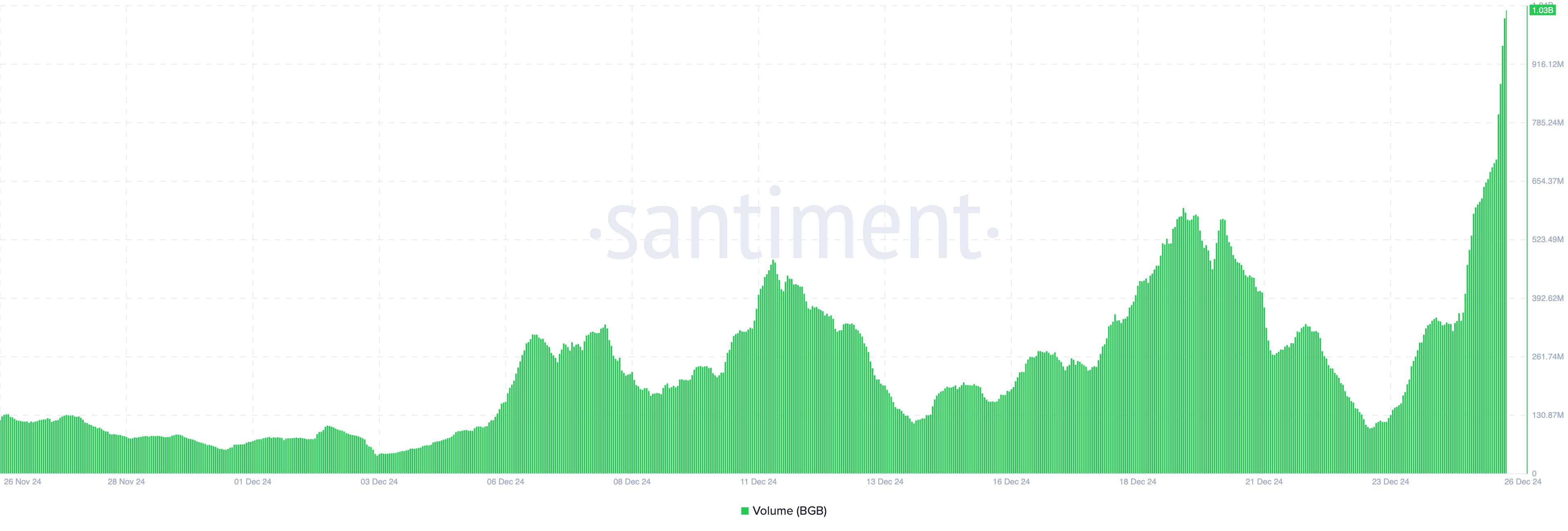 12月23日、BGBの取引量は1億ドル未満であった。Santimentによると、この数字は10倍に急増し、現在は10億ドルを超えている。取引量の急増は、暗号資産に関与する買い手と売り手の数が増加していることを示唆している。