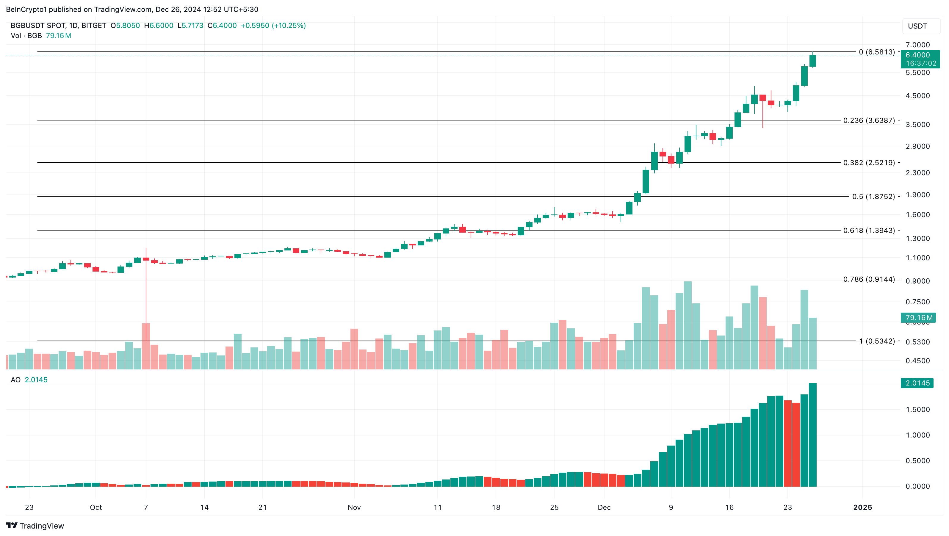 日足チャートでは、BGBの価格は高値と安値を更新し続けている。その結果、モメンタムを測定するオーサムオシレーター(AO)の読み取り値が上昇し続けている。