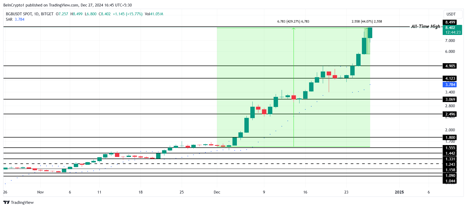 12月の間に、BGBは約430%上昇し、成長を続ける軌道に乗っています。この傾向が続けば、トークンは間もなく10.00ドルの壁を突破し、暗号資産市場での際立ったパフォーマーとしての地位をさらに固める可能性があります。