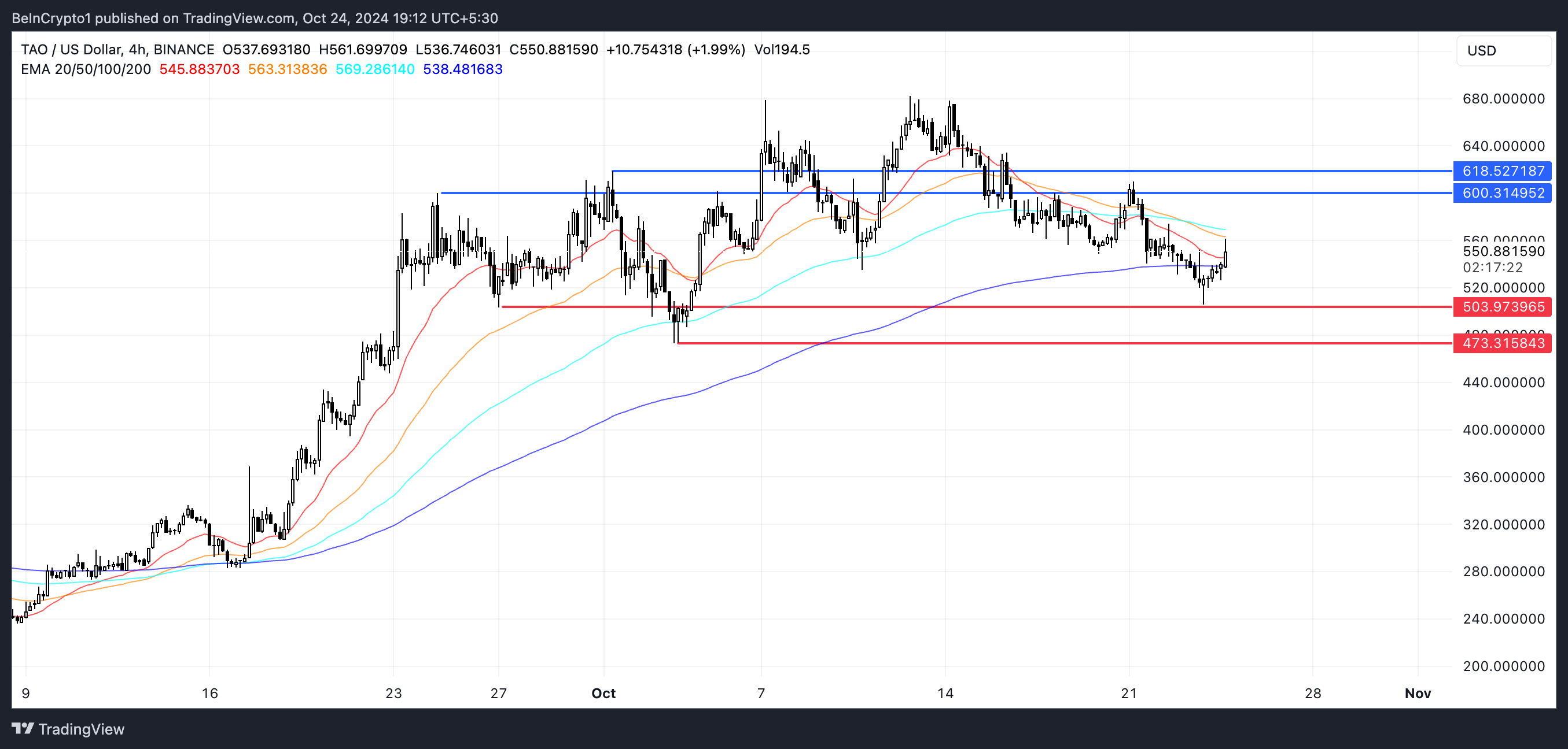 TAOの価格チャートは、価格が現在固まりの段階にあり、主要なサポートとレジスタンスレベルの間で取引されていることを示している。レジスタンスは600ドルと618ドルにあり、これまでの突破試みは失敗に終わっている。一方、サポートレベルは503ドルと473ドルであり、これまでのところ、さらなる下落に対するクッションを提供している。