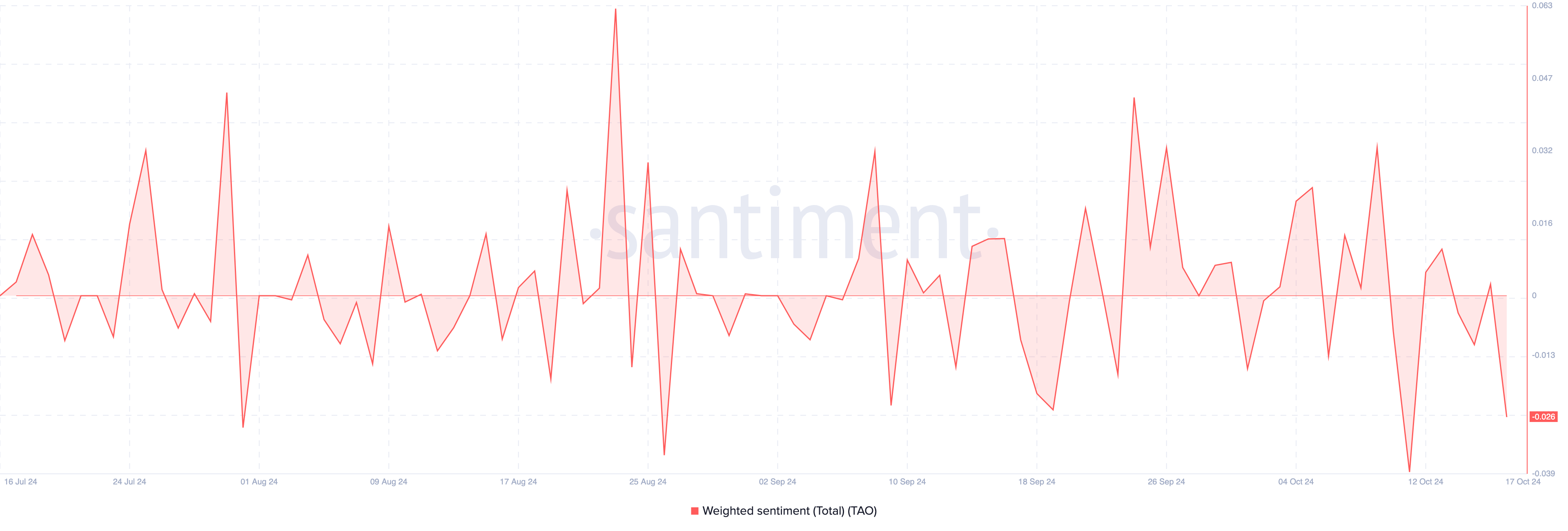 執筆時点で、TAOの感情読み取り値は-0.026である。これはアルトコインに対して広く弱気の見通しを示し、TAOへの需要が減少し、その価格が引き続き下落する可能性があることを示唆している。