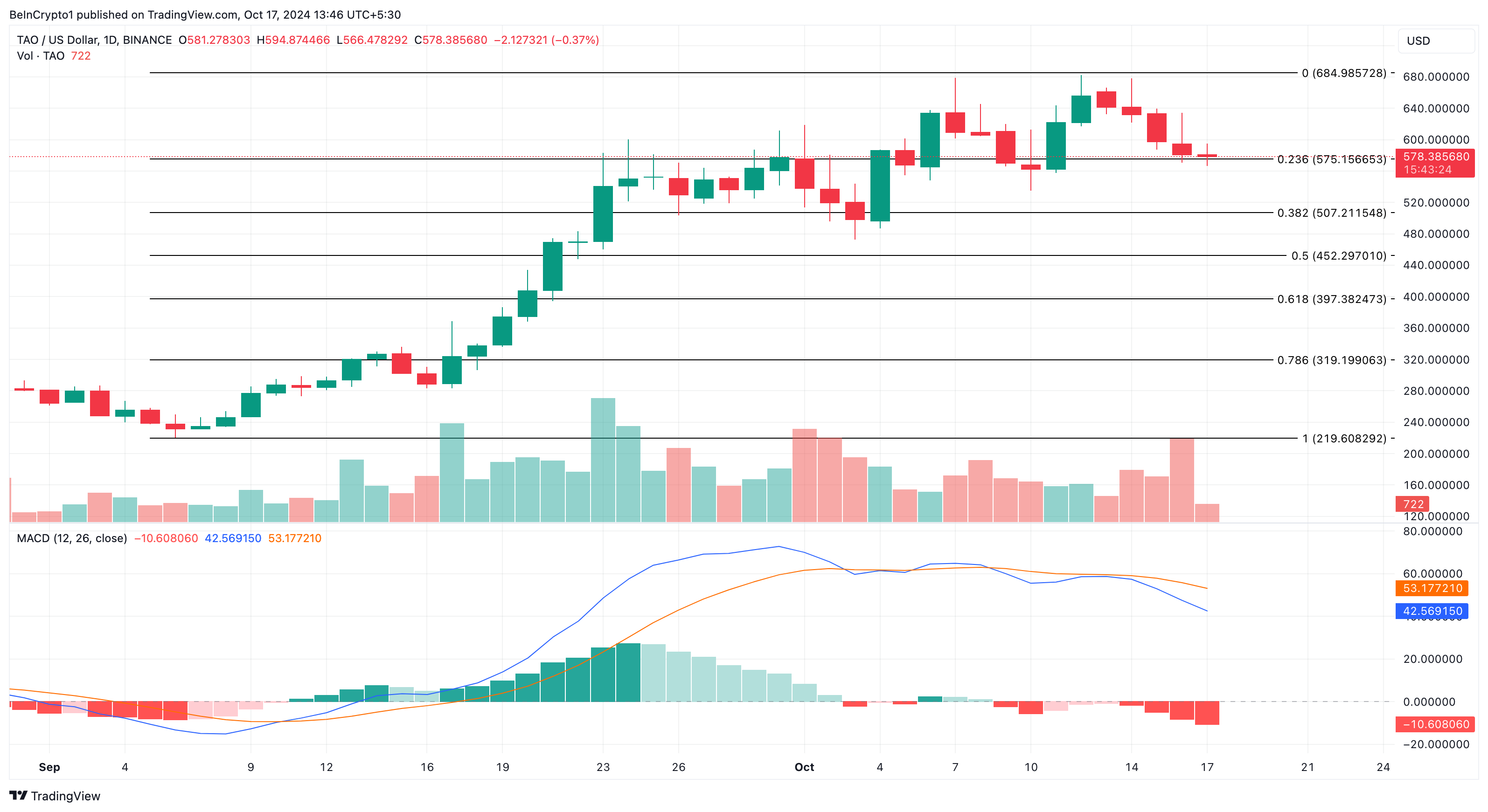この状況が続く場合、TAOの価格は38.2%のサポートフロアを下回り、452.30ドルに達する可能性がある。反対に、強気がサポートを下回らないようにすれば、TAOは648.99ドルに跳ね上がるかもしれない。