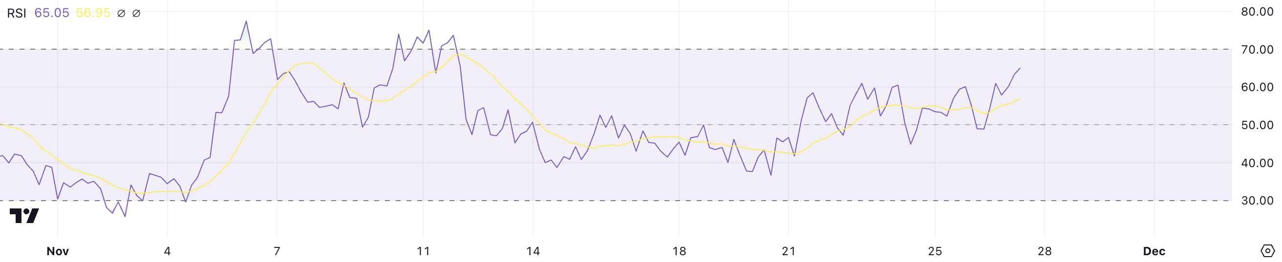 BittensorのRSIは過去2日間で49から65に上昇し、価格の急騰に伴う強い上昇の勢いを反映している。RSI、または相対力指数は、価格変動の速度と大きさを0から100のスケールで測定する。