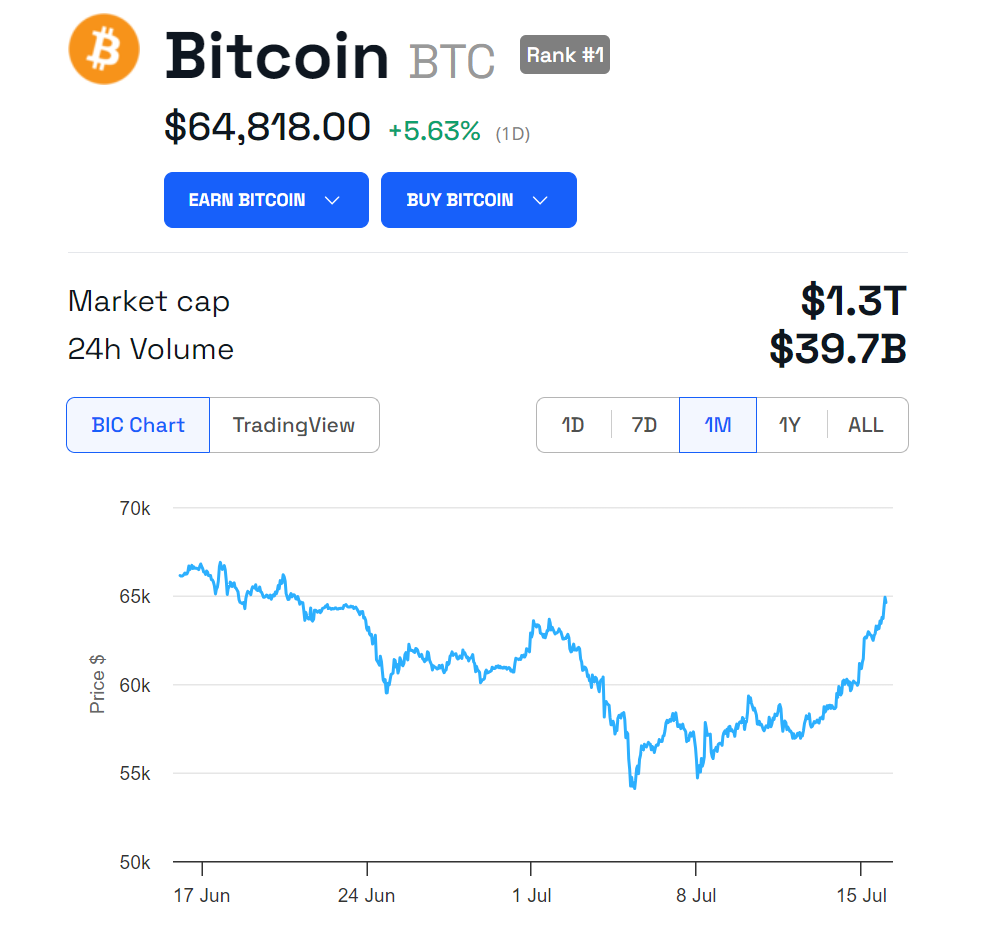 ビットコイン(BTC)の価格もフィンク氏のコメントにポジティブに反応した。本稿執筆時点では、BTCは64,818ドルで取引されており、過去24時間で5.63%の上昇を記録している。