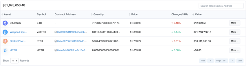 PeckShieldによると、新ウォレットに移管した暗号資産は、約7000万ドル相当の43,228stETH、290万ドル相当の1679ロケットプールrETH、127万ドル相当の771ETHが含まれていいるとのこと。同アカウントではさらに、620万USDCと472ETHを含む700万ドルの暗号資産が3,990rETHと交換された。