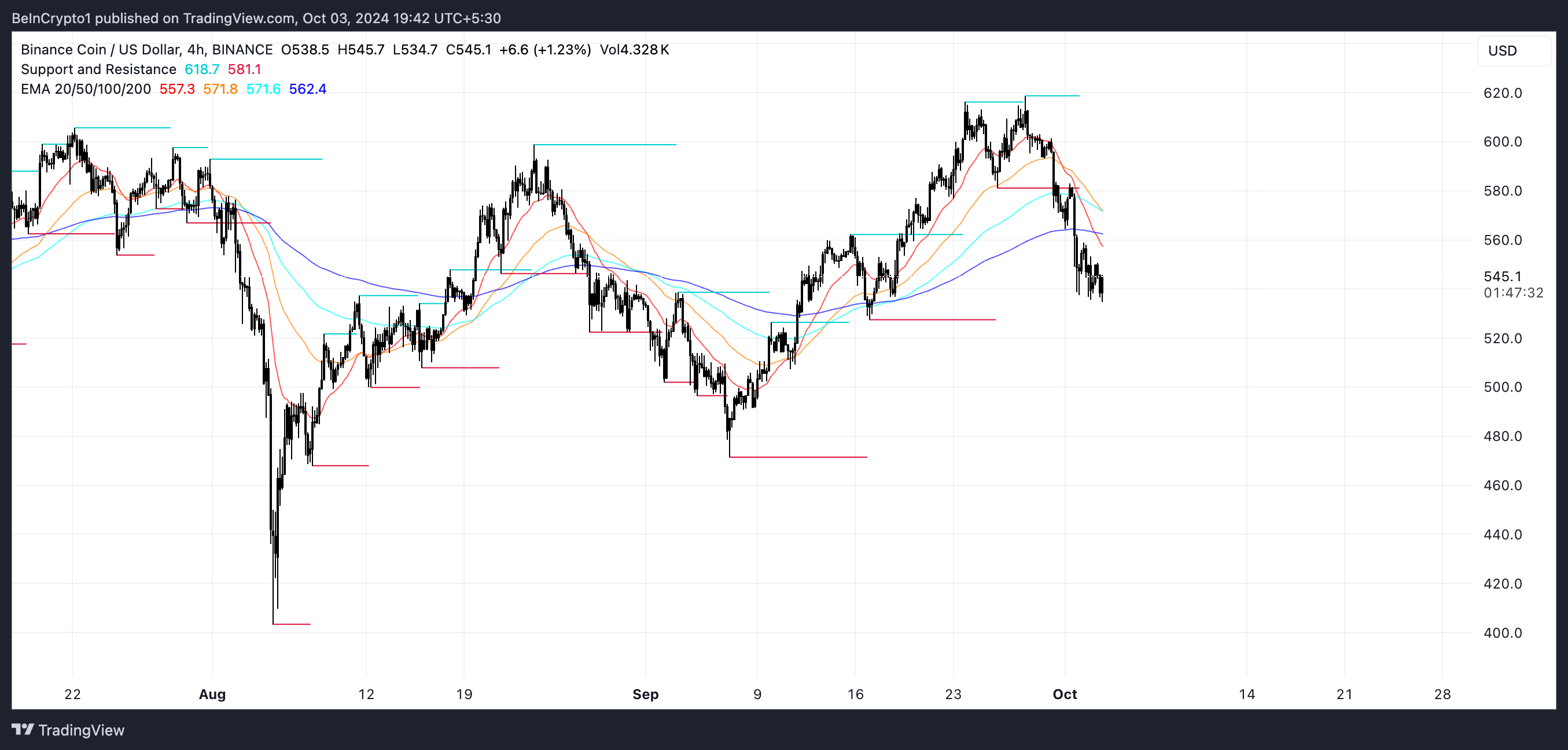 サポートとレジスタンスの重要なレベルが現在重要であり、BNBは安定化またはさらなる損失につながる可能性のある重要な価格点近くで推移しています。