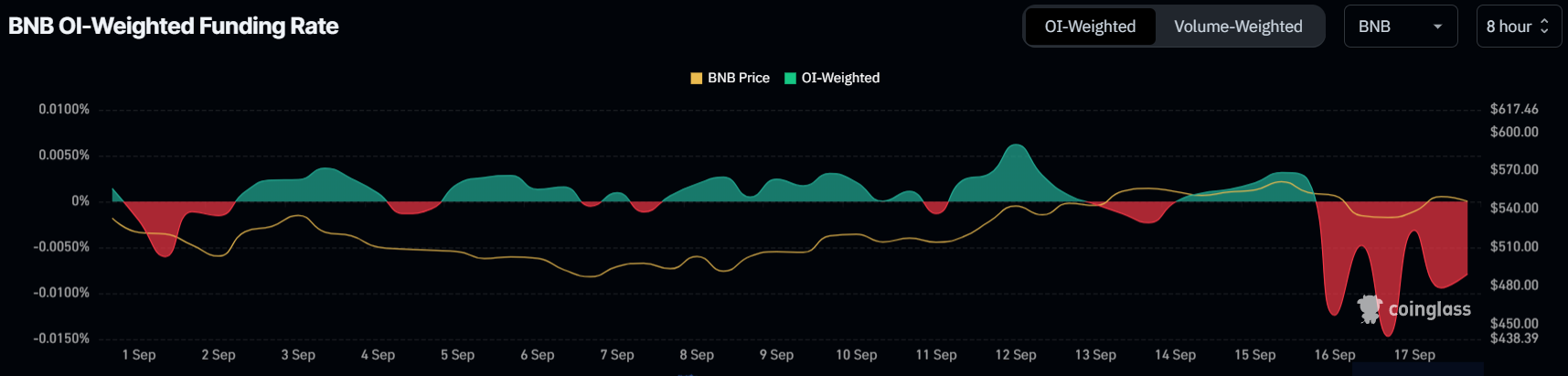 BNBを取り巻く市場センチメントは、非常にマイナスの資金調達率によって証明されるように、著しく弱気です。トレーダーは、過去2週間よりもBNBに対して悲観的になっています。違反の失敗が続いているパターンにより、トレーダーは価格の下落を予想し、最終的な下落を利用するように促しているようです。