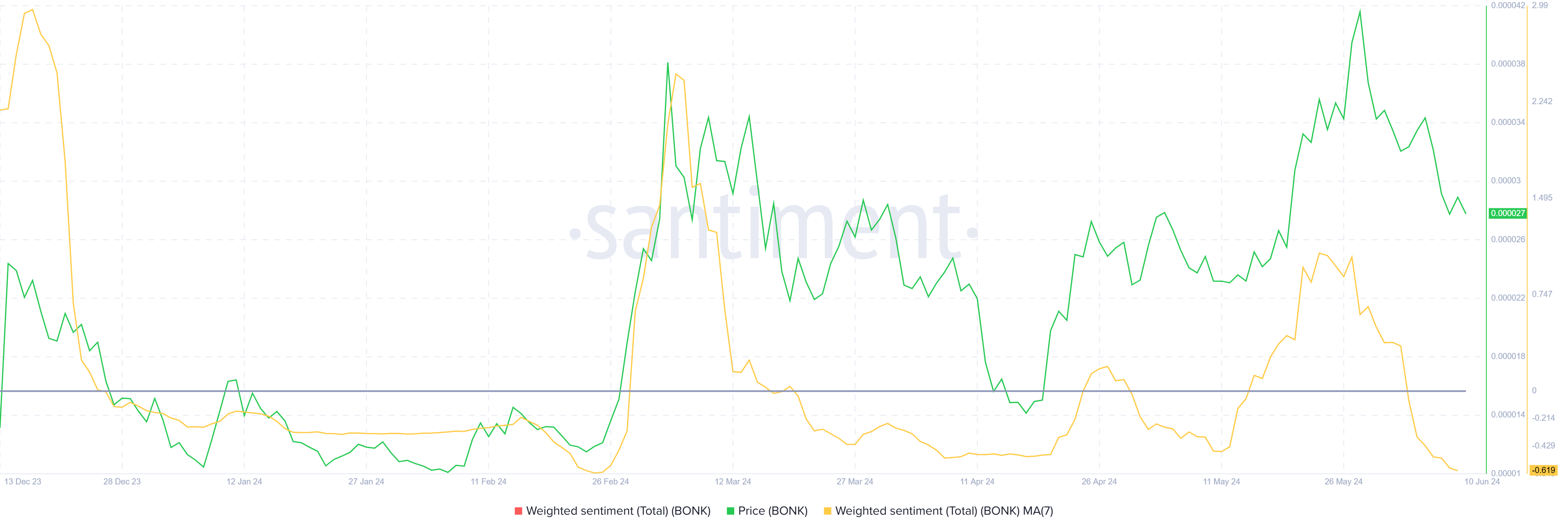 BONKの価格は保有者の楽観主義を享受していたが、マクロ環境が暗号資産市場にとって不利になるにつれ、この楽観主義は消えつつあるようだ。これは、すべてのBONK投資家の加重センチメントにはっきりと表れています。