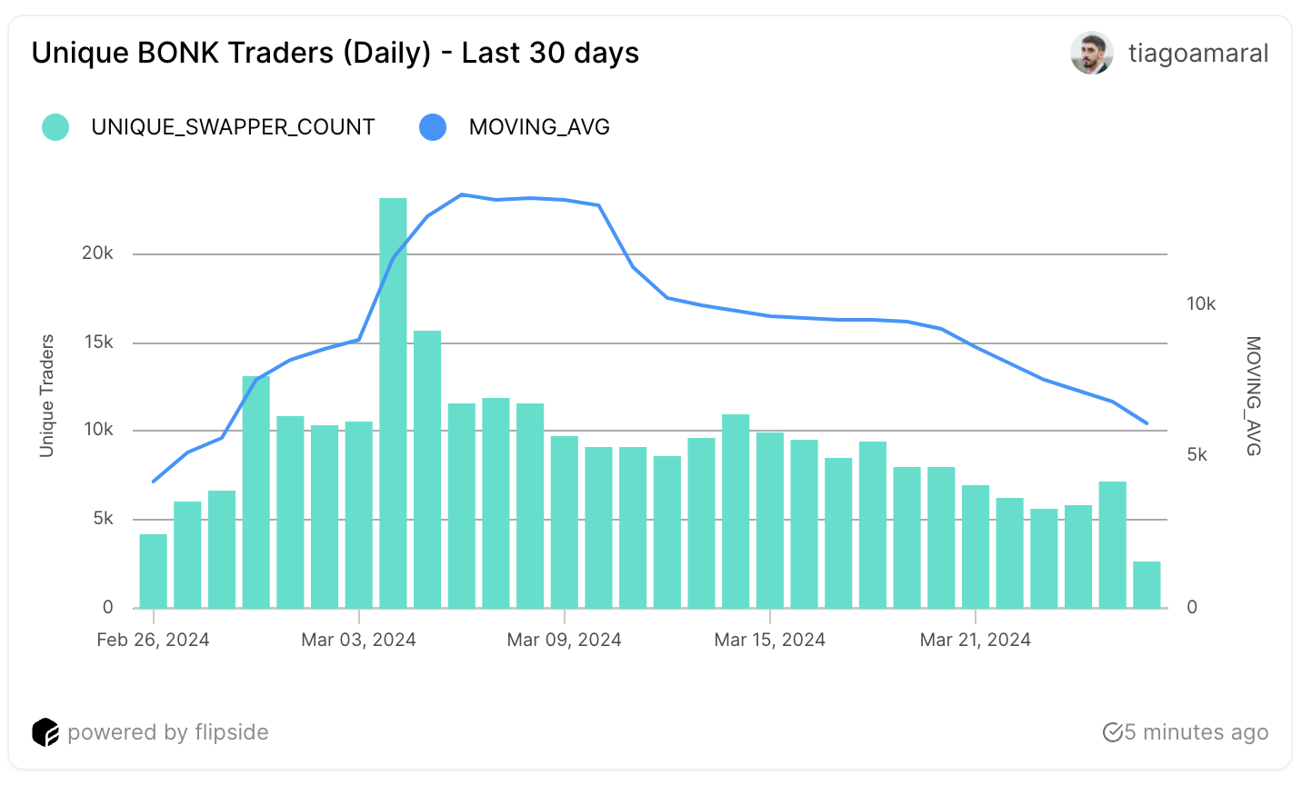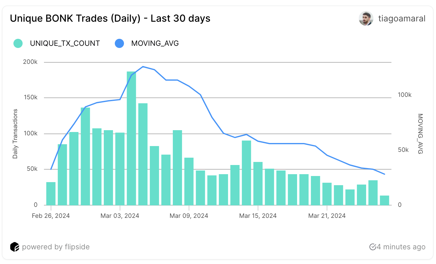 3月4日、BONKは記録的なピークを記録し、1日の取引は 187,000に達した。しかし、このピークはつかの間だった。その後すぐに急落し、3月23日には30日最安値の22,200取引を記録した。BONK取引の7日移動平均はまだ下がり続けている。しかし、ここ3日間は明るい兆しが見えている。取引活動は回復し始め、3月23日の22,200件から25日には34,800件まで上昇した。