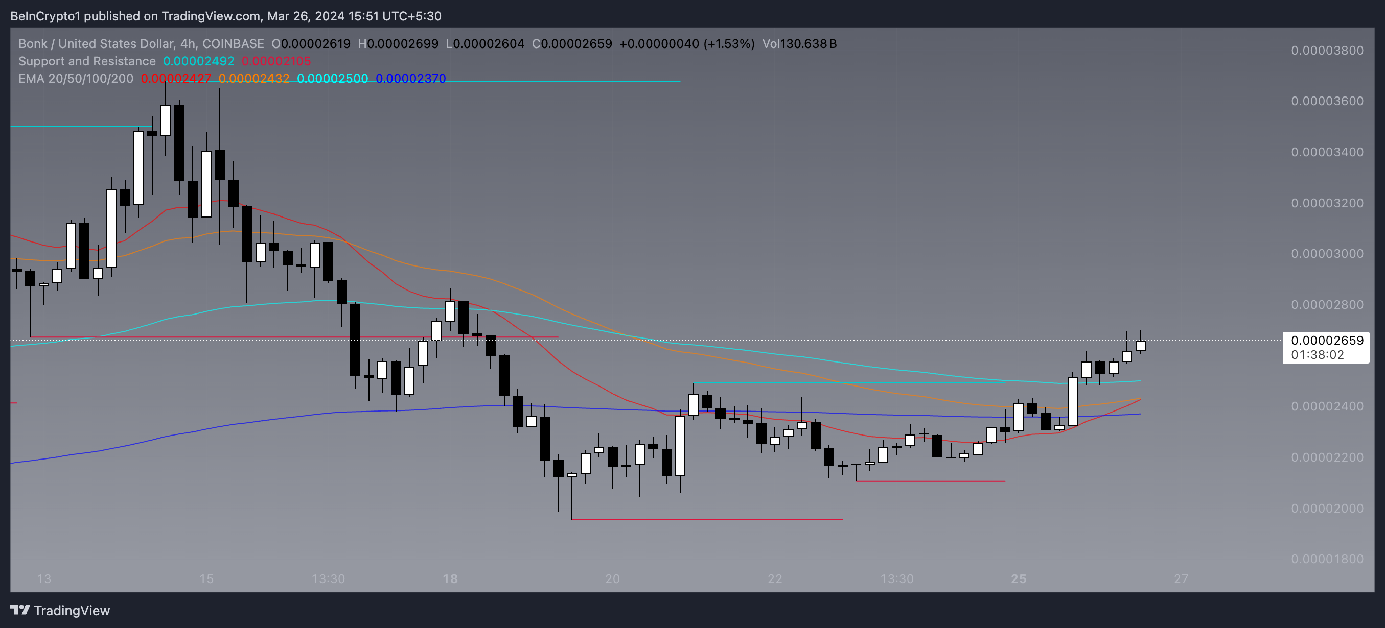 さらに、BONKの短期指数移動平均(EMA)が長 期線を上回り始めたことで、強気心理がさらに支持されている。
