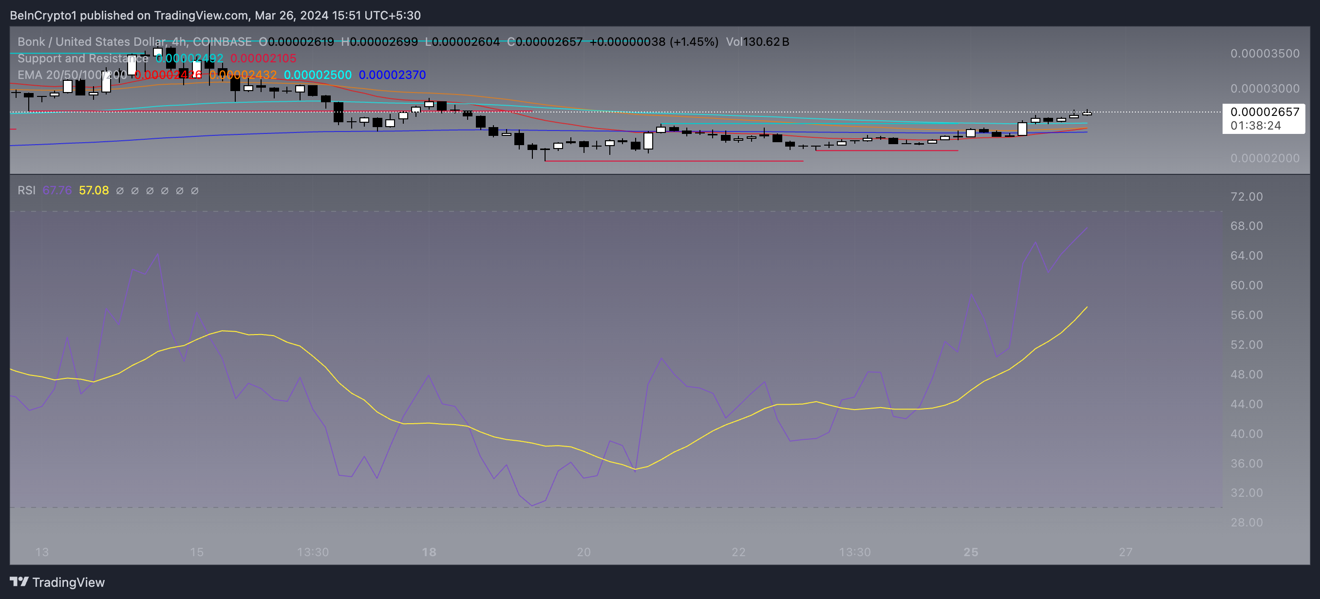 したがって、BONKのRSIが35から57に上昇したことは、投資家の信頼が高まっていることを示すものであり、ポジティブな勢いが継続する可能性がある。
