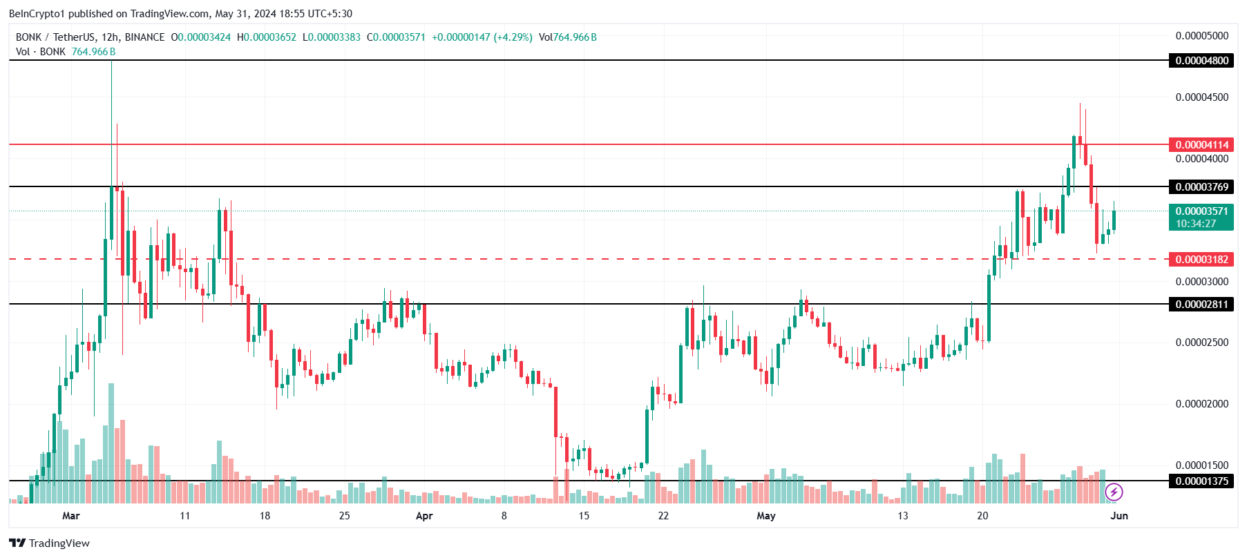 このミームコインは、0.00003769ドルと0.00003182ドルの間で推移する可能性がある。これにより、暗号資産は、上昇を開始する前に投資家の信頼を取り戻すことができるだろう。