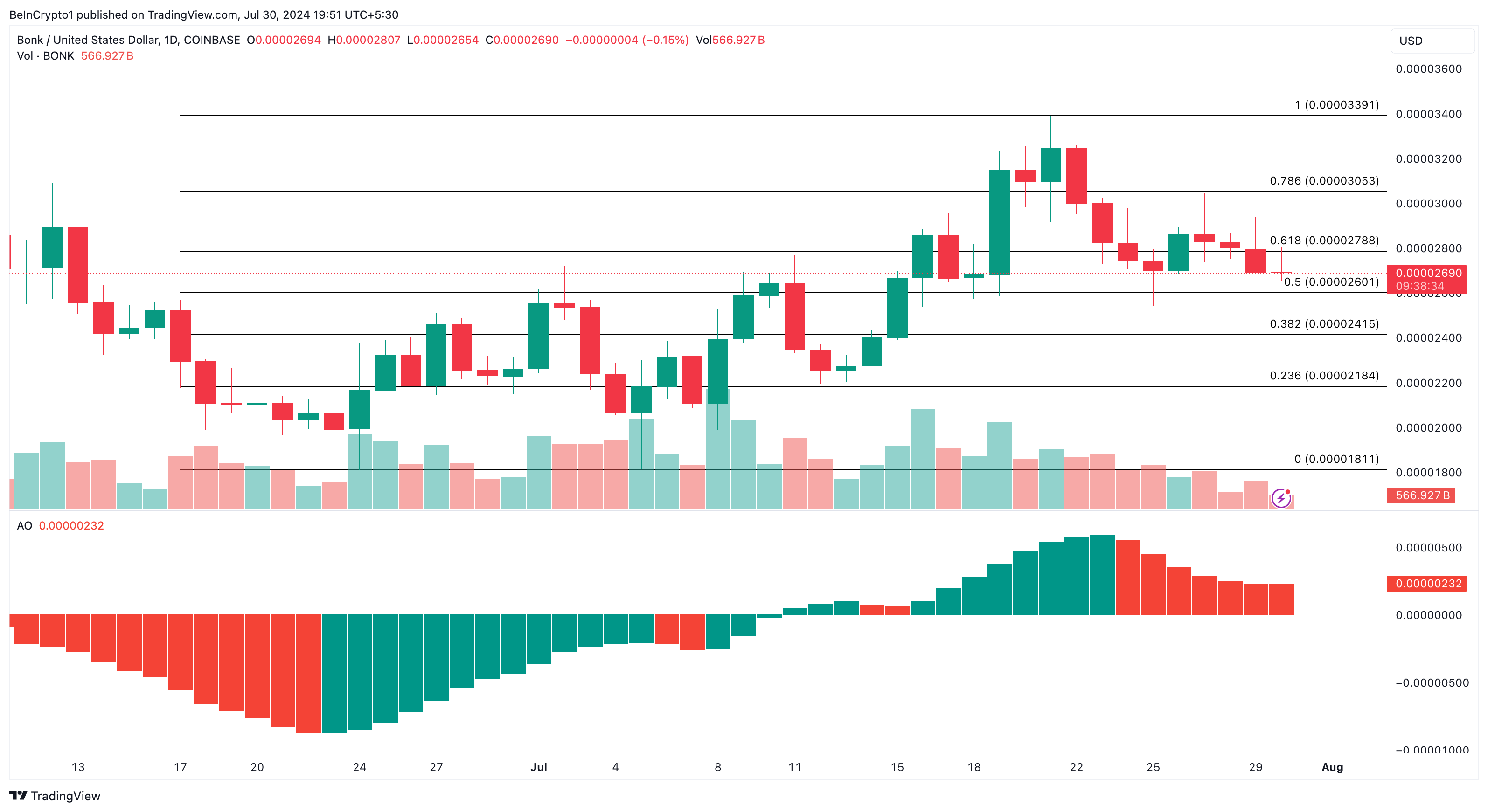 黄金比としても知られるフィボナッチ61.8%レベルを上回ったことで、BONKの反発の試みが信用された。また、オーサムオシレーター(AO)が赤色バーの減少を示し、下降モメンタムが弱まっていることを示している。
