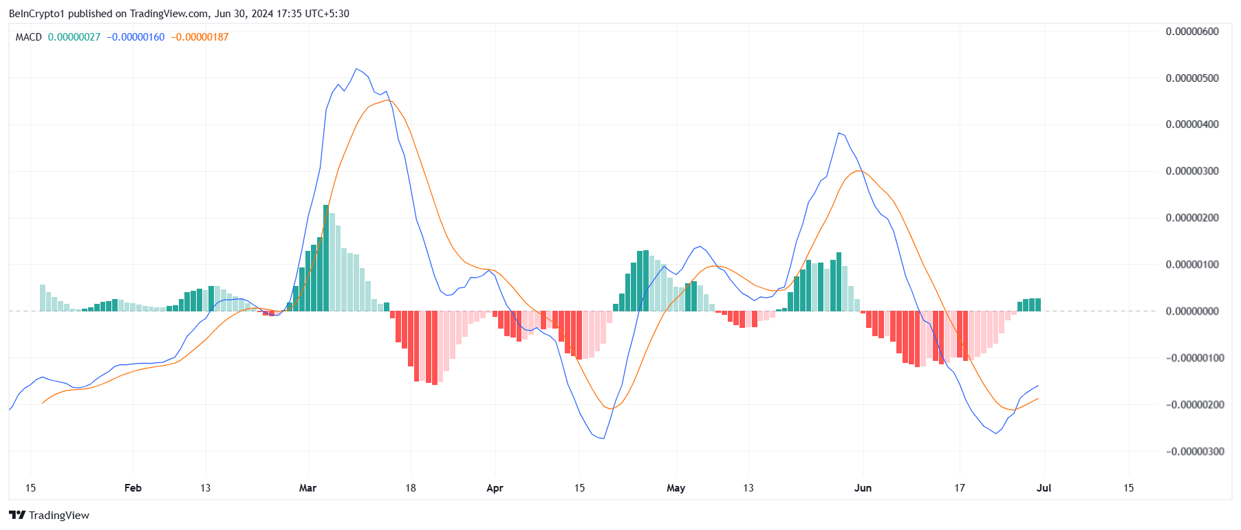 市場は強気だが、投資家は弱気であるため、BONK価格は今後数週間、横ばいの勢いを示す可能性がある。移動平均収束ダイバージェンス(MACD)は最近、強気のクロスオーバーを経験した。このような現象は6月初旬以来のことである。