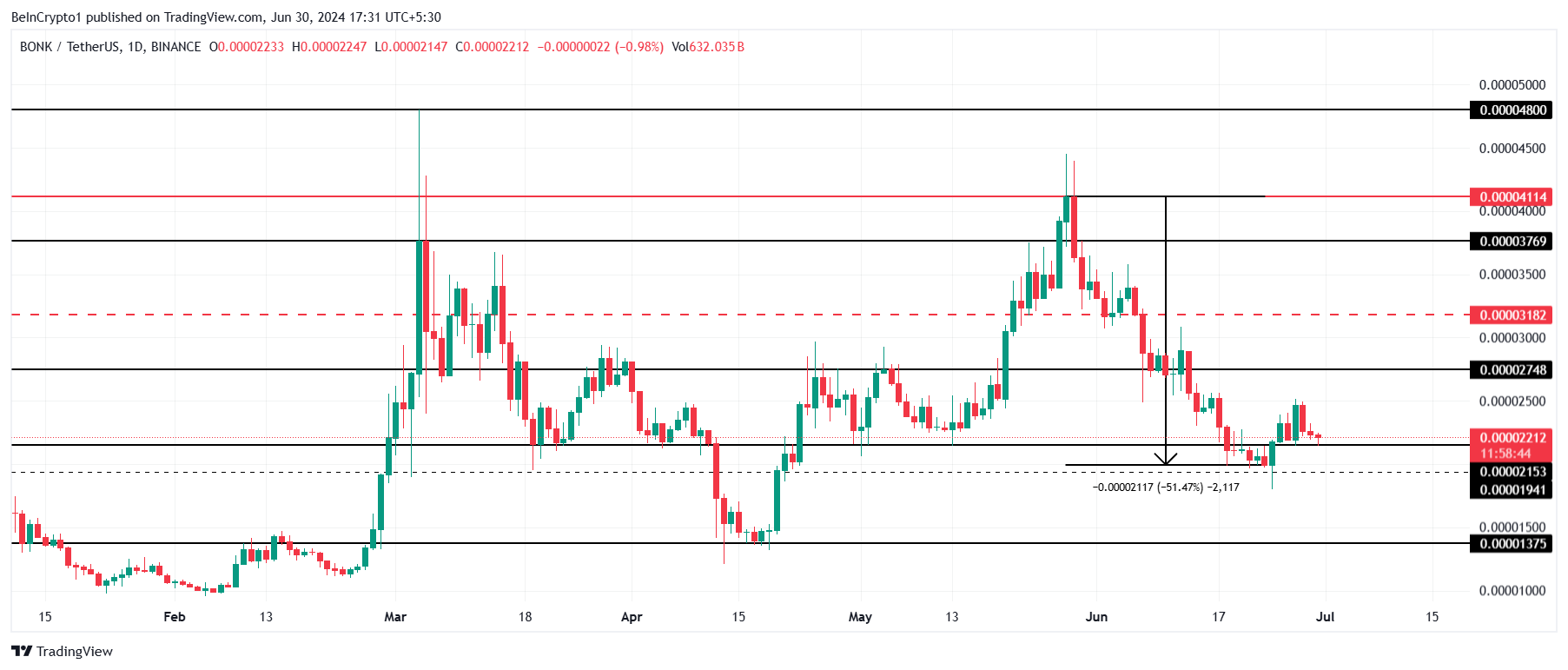 BONK価格は、6月を通して51%下落し、0.00001950ドルで取引されましたが、その後わずかに回復し、0.00002212ドル以上で推移しています。その際、アルトコインは投資家を怯えさせ、それ以来、投資家は弱気と強気の間を行き来している。