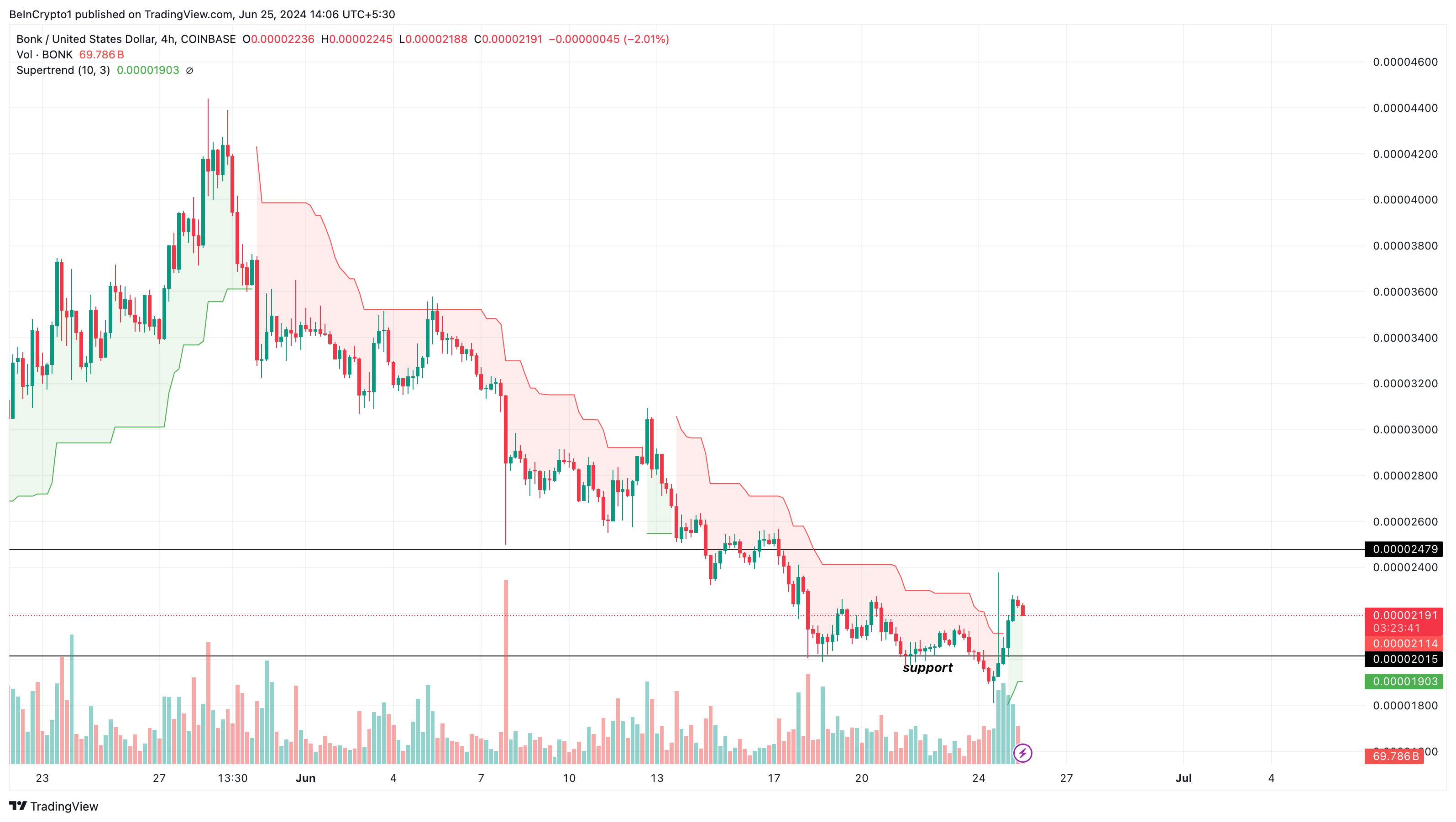 にもかかわらず、4時間足BONK/USDチャートの分析は、トークンのさらなる上昇を示唆しています。スーパートレンドがこの予測をリードしている。