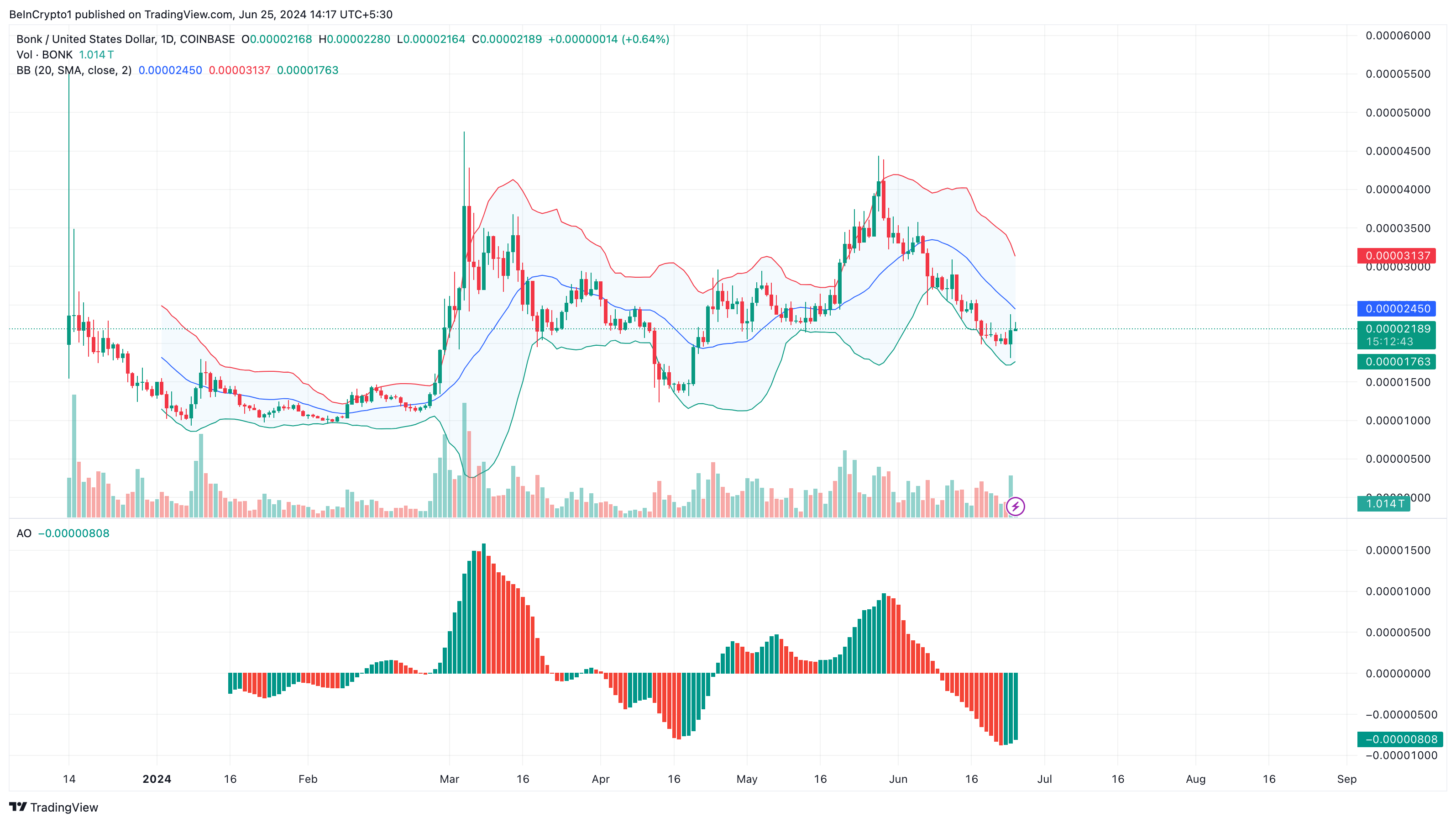 プレス・タイムでは、バンドは拡大していますが、どちらもBONKの価格をタッチしていません。これは、売られすぎでも買われすぎでもないことを示唆し ている。