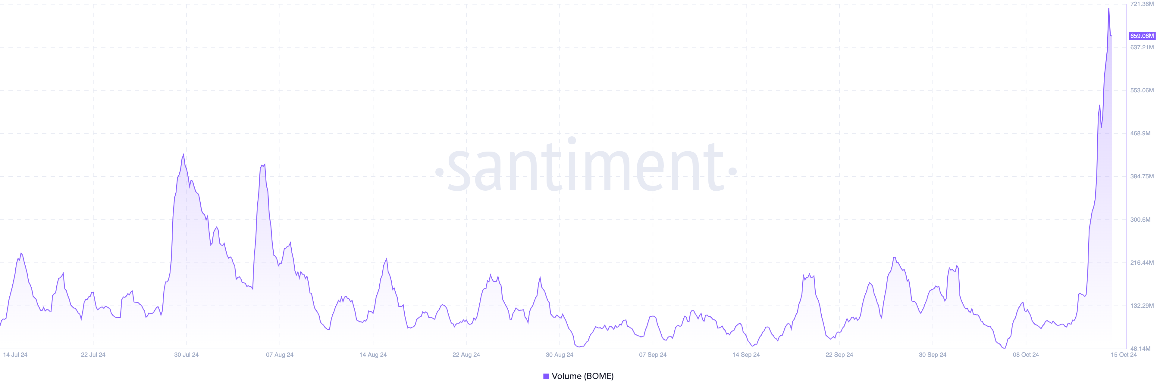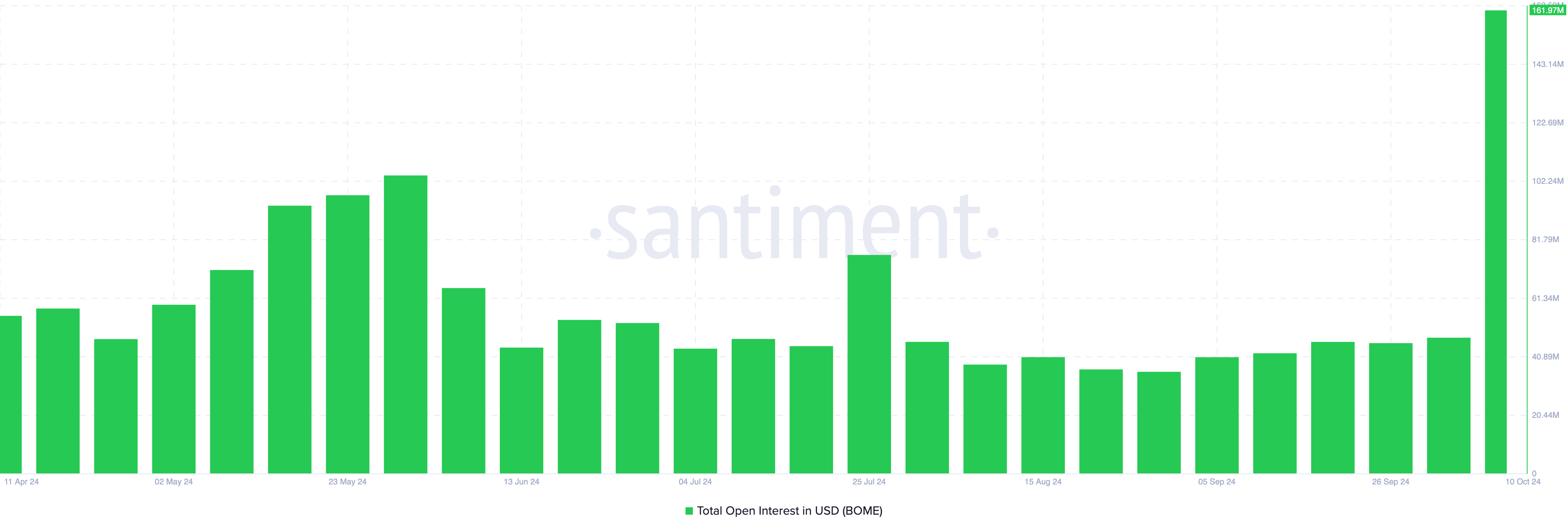 BOMEは価格だけでなく、そのオープンインタレスト(OI)によっても注目を集めています。Santimentによると、トークンのOIは新たな最高値の1億6197万ドルに達しました。驚異的な価格急騰と同時に、このOIの急増は、派生市場での投機活動の重要な指標であり、ミームコインへの投資家の関心が高まっていることを示唆しています。