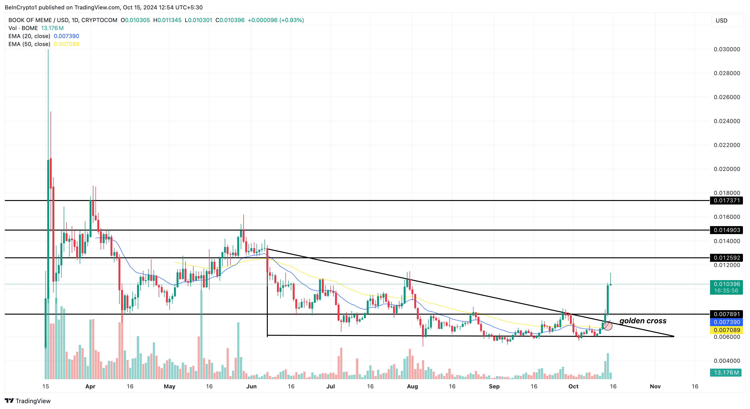 Book of Meme(BOME)の価格が15日、7月以来初めて0.011ドルに達しました。これは過去7日間でソラナのミームコインの価格が62%跳ね上がった後のことです。