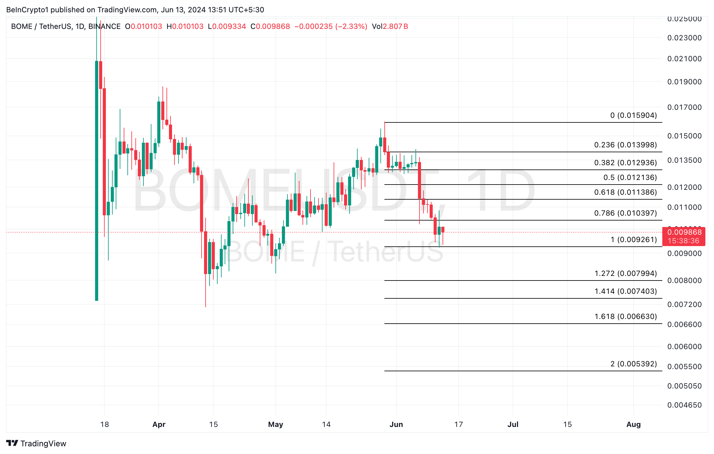 BOMEの価格は過去7日間で29%下落した。これは、時価総額トップ10のミーム資産の中で、過去1週間で最も損失が大きかったFloki (FLOKI)に次いで2番目のトークンとなった。