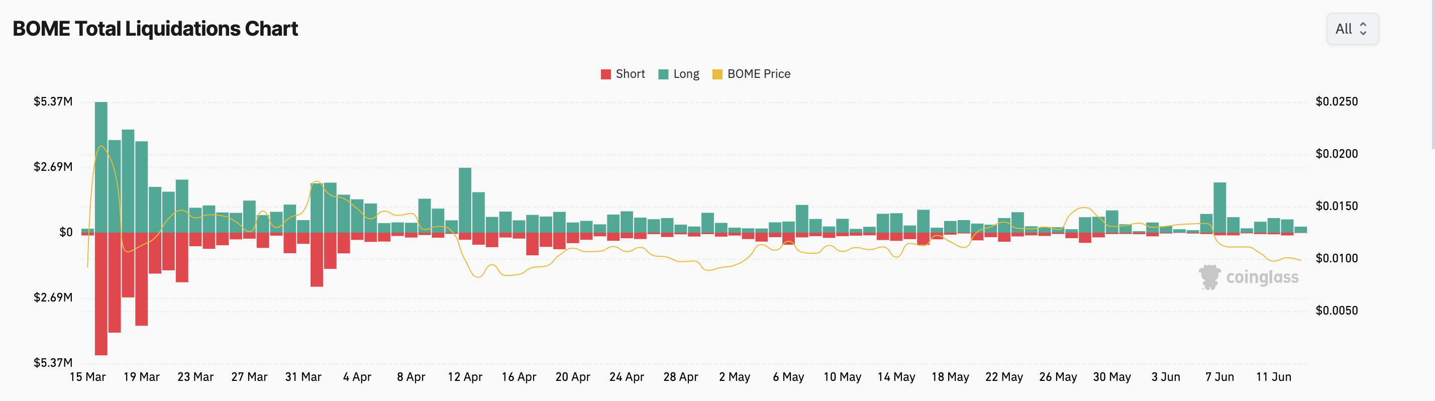 Sponsored Sponsored先週のBOMEの価格下落により、多くのロングポジションが清算された。ちなみに、6月7日のロング清算は合計206万ドルで、BOMEの4月12日以来の高水準だった。