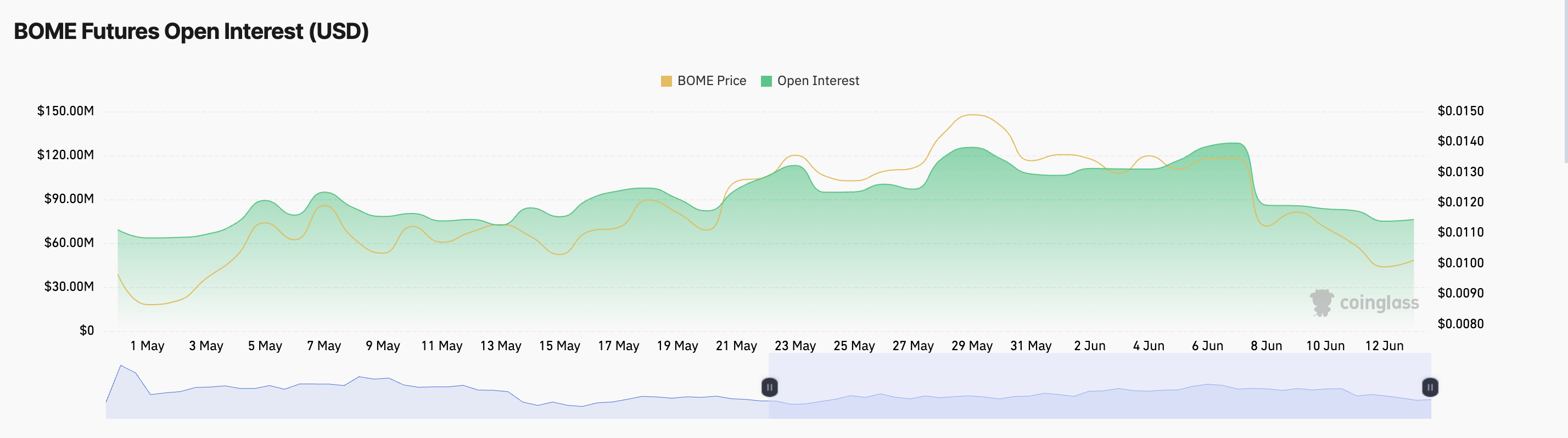 BOMEの価格は6月6日に0.013ドルでピークをつけ、その後下落傾向にある。その下落トレンドは、同じ日に下落し始めた先物建玉の減少と一致している。
