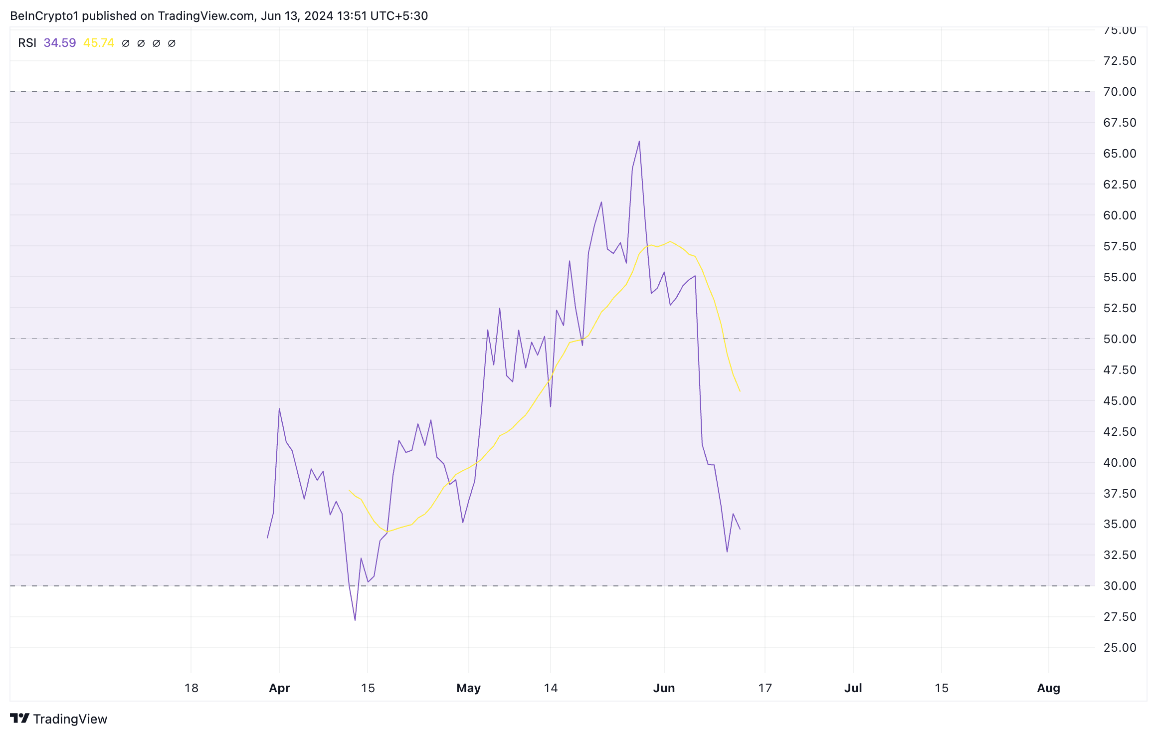 BOMEの主要モメンタム指標は、ミームコインの需要の低さを裏付けている。例えば、相対力指数(RSI)は、報道時点で34.31であった。