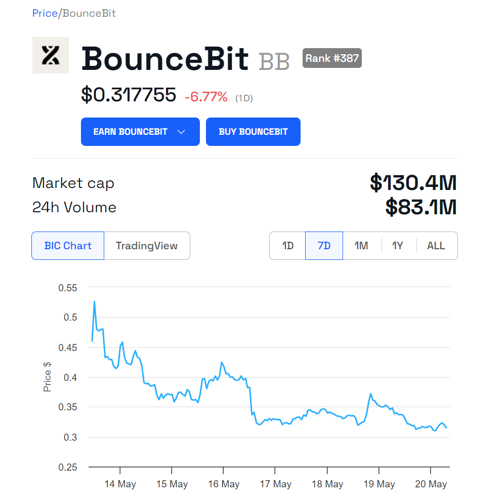 BeInCryptoの以前のレポートによると、BounceBitは5月13日にメインネットを立ち上げ、ネイティブトークンであるBBのエアドロップとともに、複数の暗号資産取引所が上場しました。現在の時価総額は1億3,040万ドルにもかかわらず、BBの価格はローンチ時の0.46ドルから0.31ドルまで下落し、過去24時間で6.77%の下落を反映した。