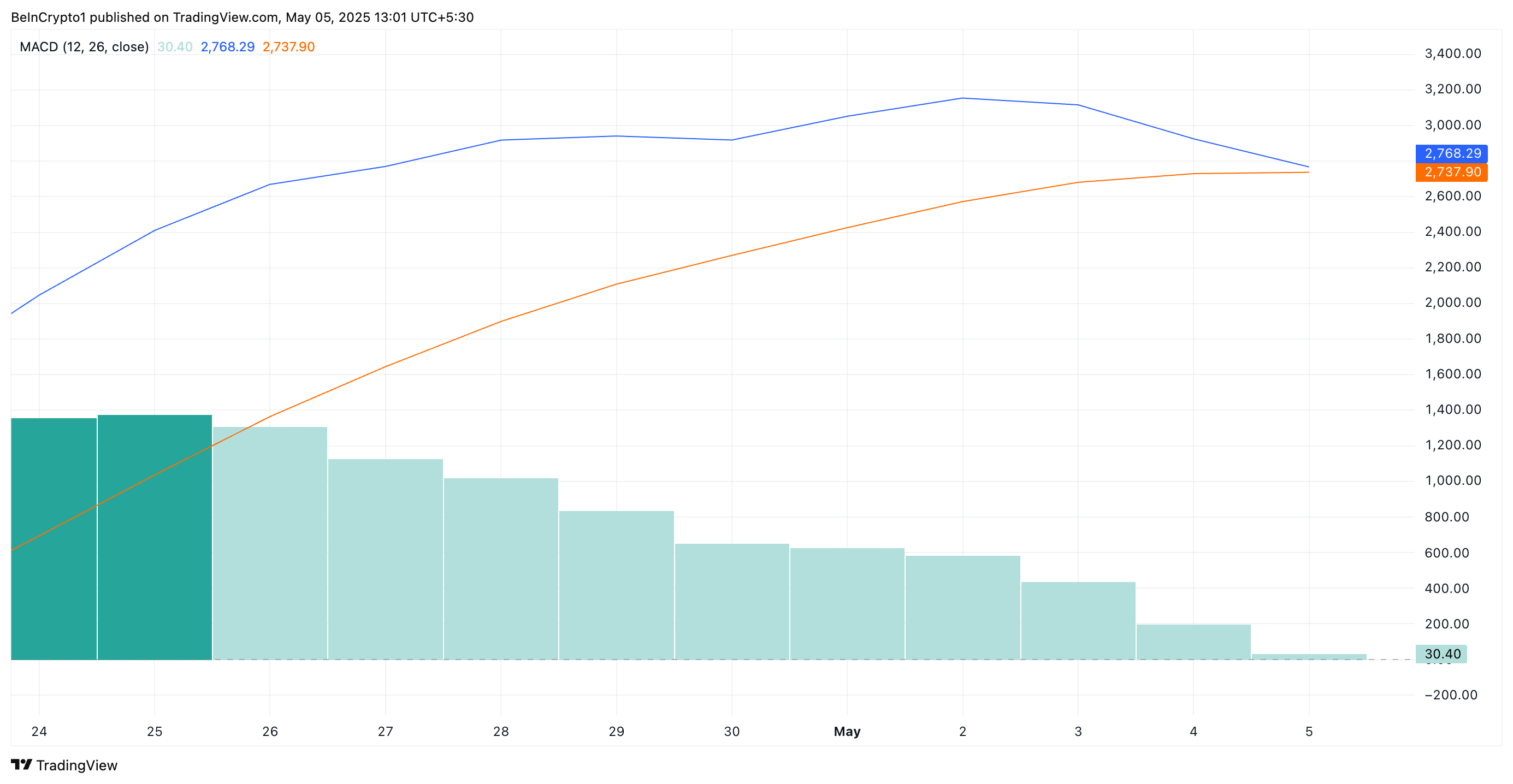 BTCの移動平均収束拡散(MACD)指標はデスクロスを形成しようとしている。これはMACDラインがシグナルラインを下回るときに発生する技術的パターンである。