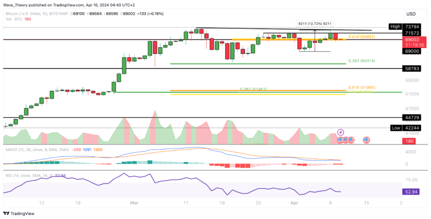 重要なことは、BTCのさらなる発展は、約6万9,000ドルの黄金比サポートレベルが価格行動のフロアとして効果的に機能できるかどうかにかかっている。この水準は極めて重要なポイントであり、このサポートからの跳ね返りが成功すれば、BTCの強気の勢いが再び強まり、さらなる上昇への道が開かれる可能性があるからだ。