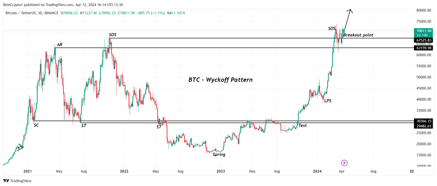 3日間のビットコイン価格は、ウィコフパターンを検証している。ウィコフパターンは、市場動向、出来高、プライスアクションを分析し、蓄積と分配の局面を特定する取引手法である。