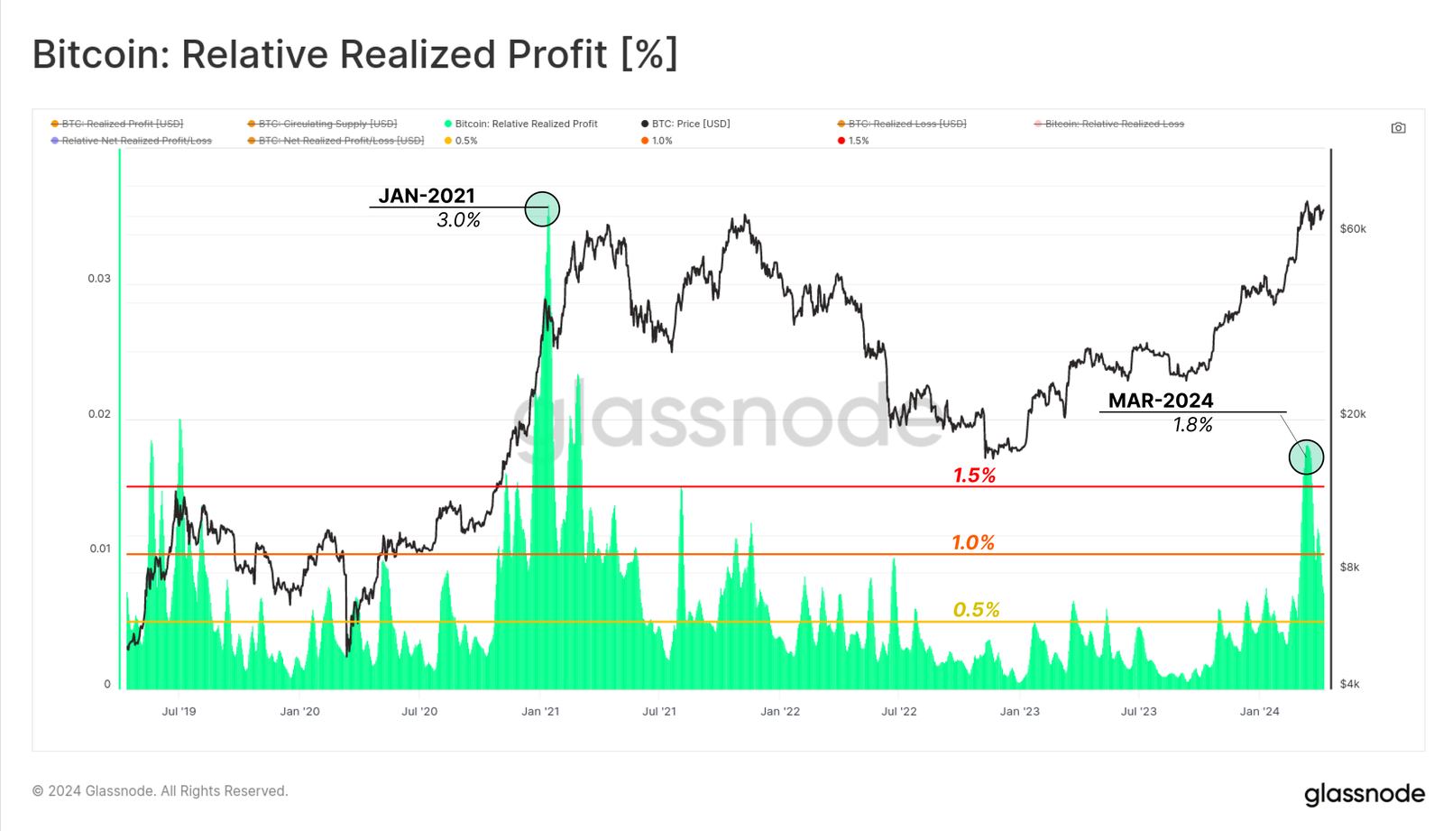 このことは、相対実現利益を見れば明らかである。現在の強気サイクルの利益確定売りと2021年サイクルの利益確定売りを比較すると、今回の投資家はより安定的であることがわかる。2021年の史上最高値6万4,500ドル前後では、実現利益は3%であった。