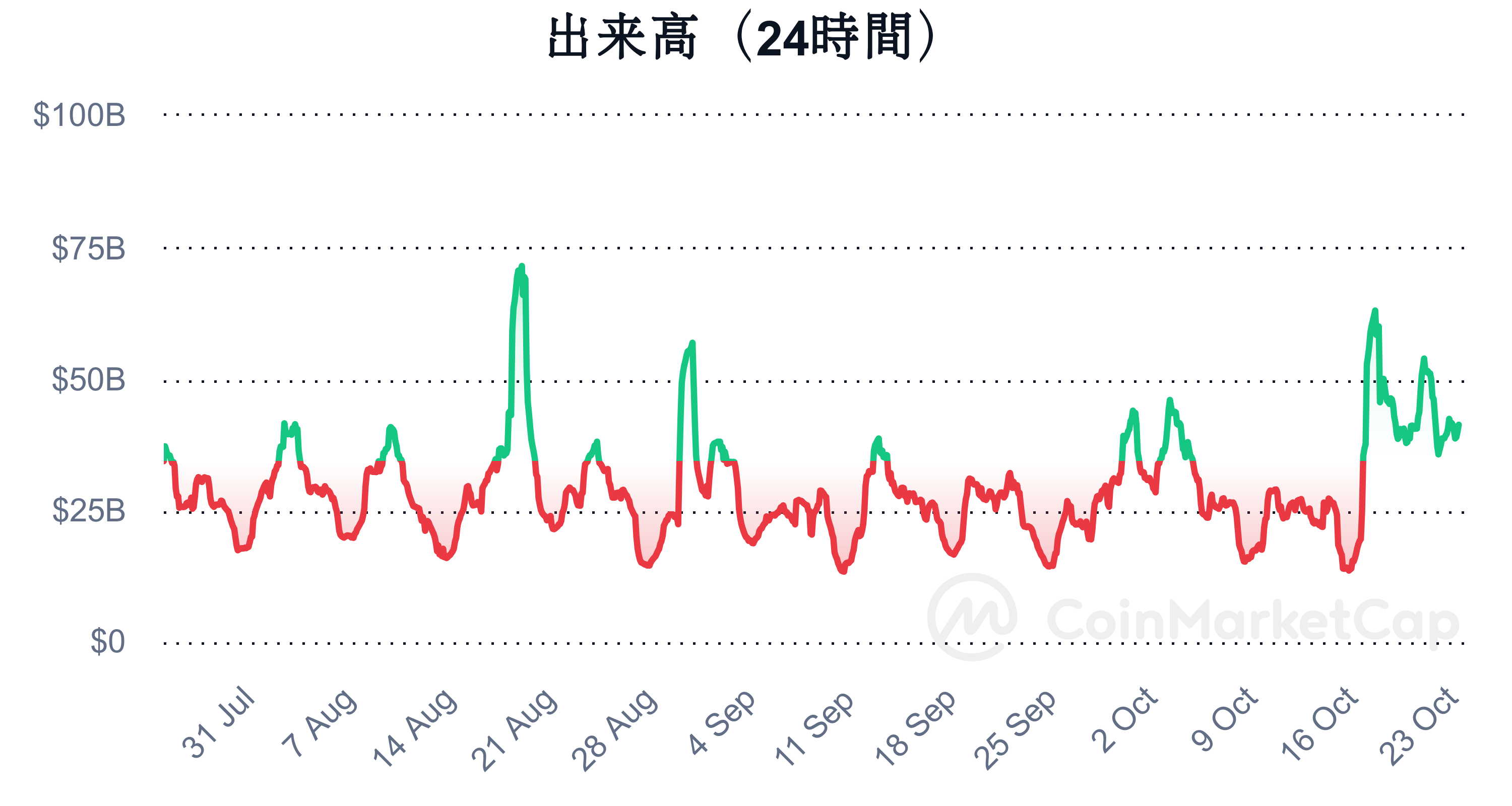 仮想通貨市場の現物取引プラットフォームにおける7日移動平均の日次取引量は、9月26日の938億ドルから20日には1兆5000億ドルを超えるまでに増加。短期的には上昇基調にある一方で、現在の月間現物取引量は、仮想通貨市場としては過去最低の水準にある。9月、仮想通貨取引所は31兆1000億ドルの月次取引量を記録し、20年以来の最低水準を更新した。