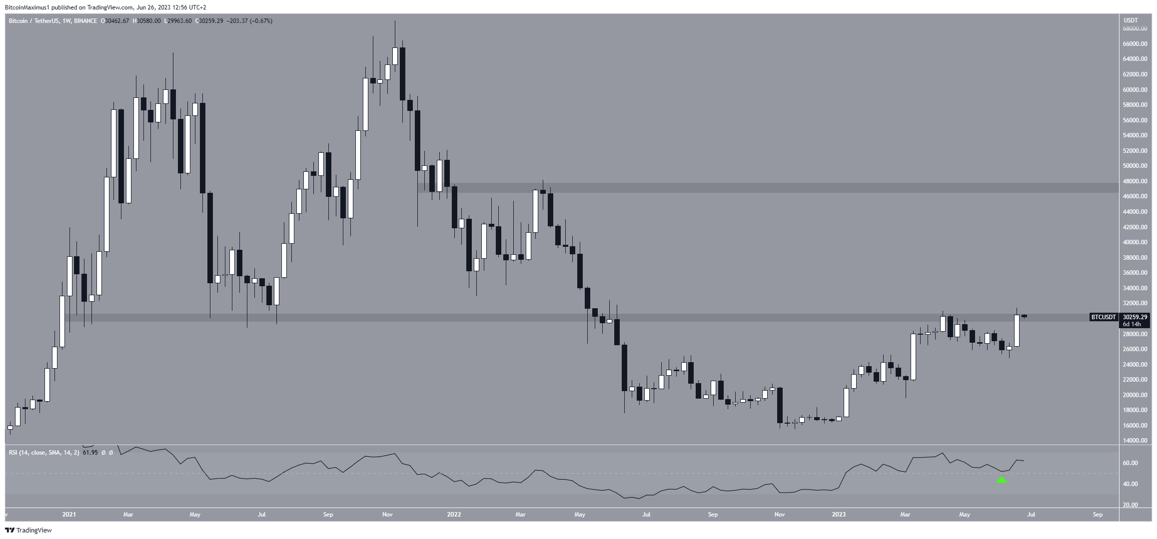 週足チャートのテクニカル分析によると、ビットコイン価格は3万ドルの水平ラインに達した。これは最も重要な水平ラインの一つであり、2023年の年初から、支持線(サポートライン)兼抵抗線(レジスタンスライン)として機能してきた。23日、ビットコイン価格は3万1443ドルに上昇し、年初来高値を更新した。その後は下落したものの、週足終値も年初来高値を更新した。