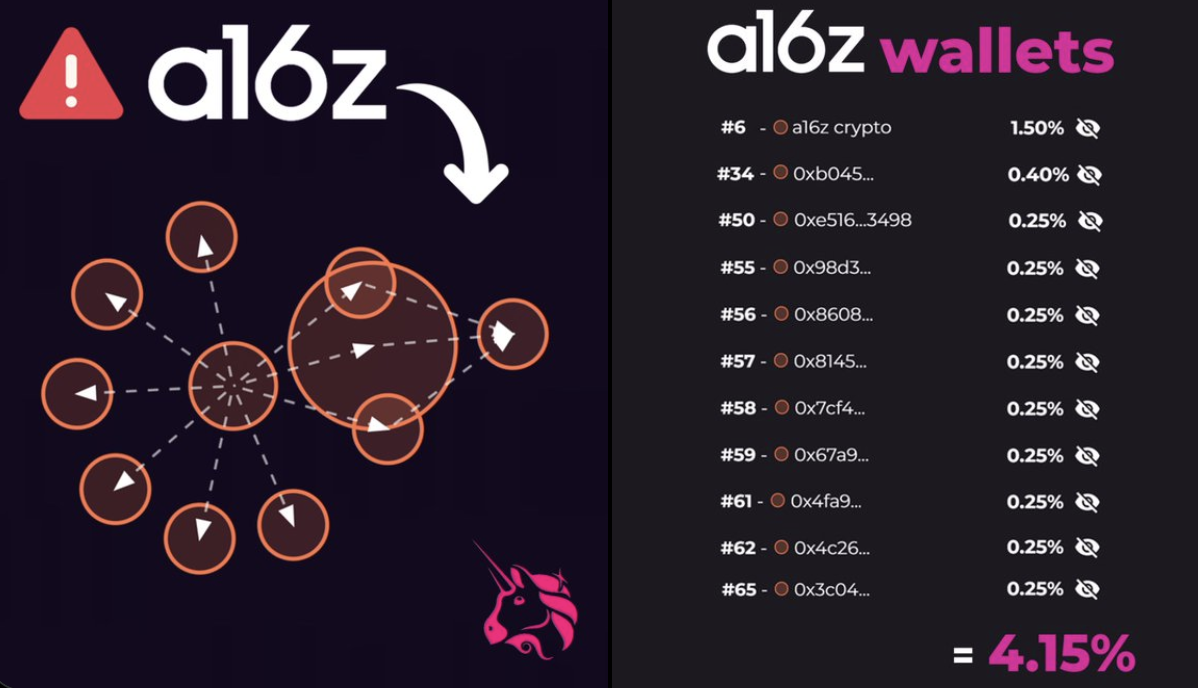 Bubblemapsは、a16zが分散型取引所(DEX)UniswapのUNIトークン4150万を制御しており、供給の4%以上を占めていることを特定しました。