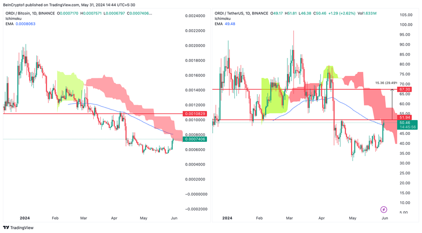 ORDI/BTCチャートは、主要な抵抗線が確認された状態でのコンソリデーションを示している。日足一目均衡表と100D EMAを下回る値動きは、強気ブレイクアウトの可能性を示している。