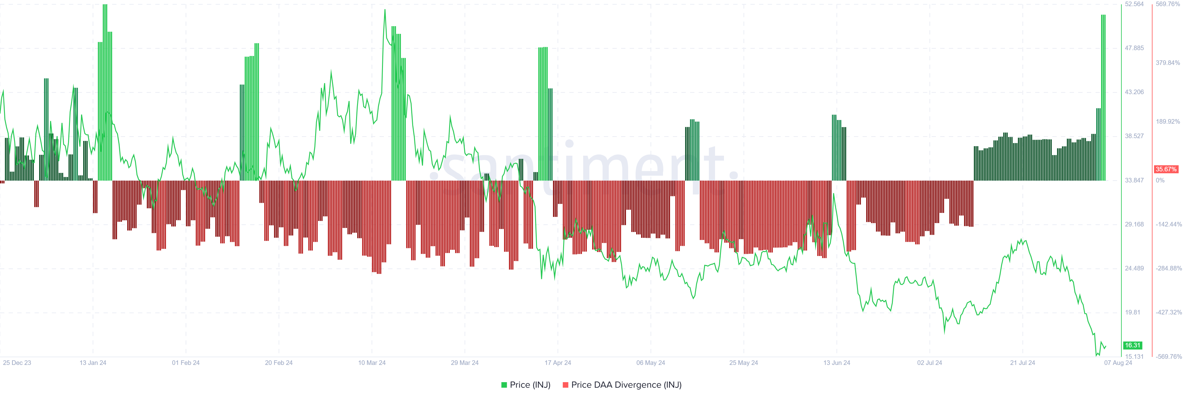 さらに、価格DAA(ダイバージェンス累積分析)はINJの買いシグナルを点滅させている。このシグナルは、市場参加者の大幅な増加によって 強化されている。市場参加者はポジティブな値動きに先行することが多く、 投資家の関心の高まりを反映している。