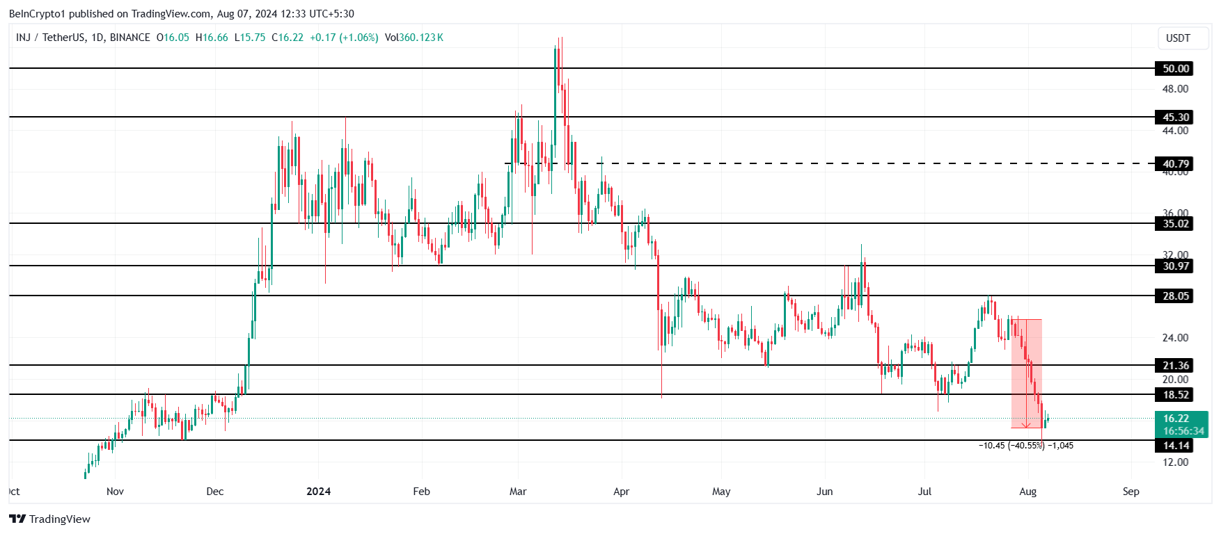 16.2ドルのインジェクションの価格は、8カ月ぶりの安値14.1ドルを付けそうになった後、反発している。INJが最後にこの価格になったのは2023年12月だった。したがって、このアルトコインにとって、まず18.5ドルの抵抗を突破し、サポートに変えることが重要である。