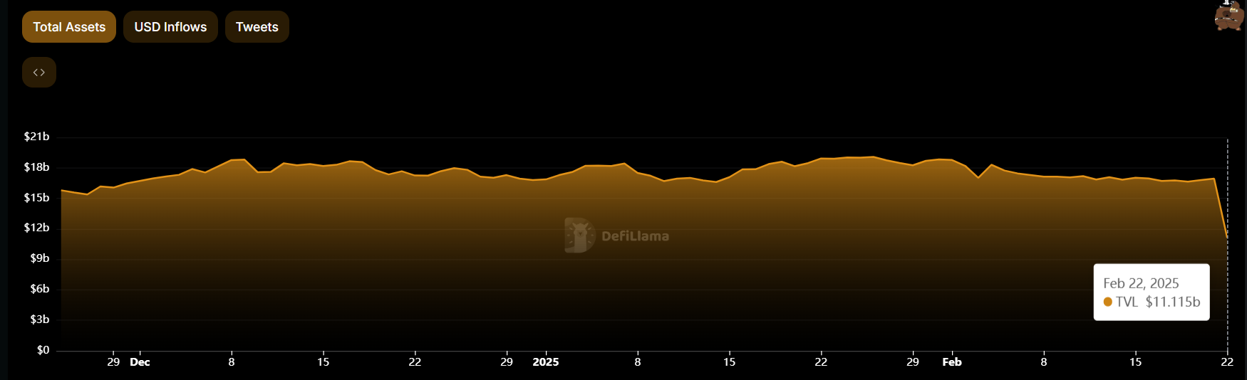 データによれば、DeFiLlamaからの情報で、バイビットの準備金は24時間以内に約52億ドル減少した。この減少にもかかわらず、オンチェーンデータは、取引所が依然として114億ドル以上の資産を保有していることを確認している。