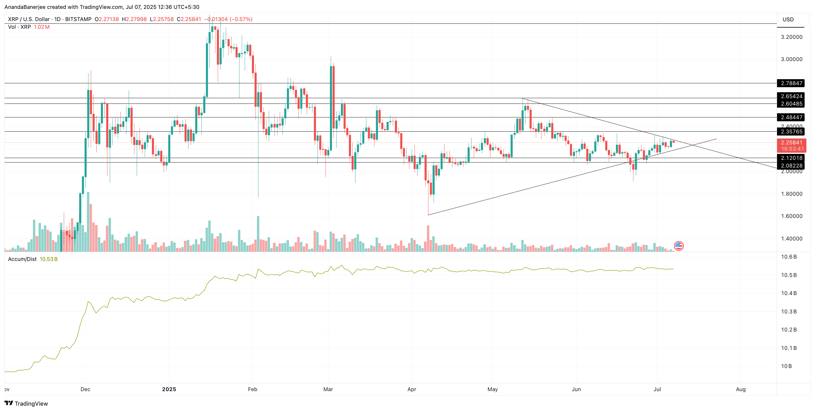 暗号資産(仮想通貨)XRPの価格が上昇基調にある。7月3日には対称ペナント型のチャートパターンを上抜け、節目とされる2.20ドルを超えた。急騰ではないものの、取引量の緩やかな増加が続いており、市場では静かな蓄積局面との見方が広がっている。