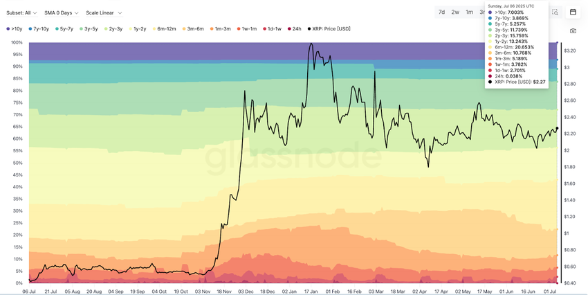 XRPのHODLウェーブチャートは、強い保有者の確信を示している。流通供給の40%以上が1年以上動いておらず、長期的なコホートバンドは最近のXRP価格の動きにもかかわらず安定している。