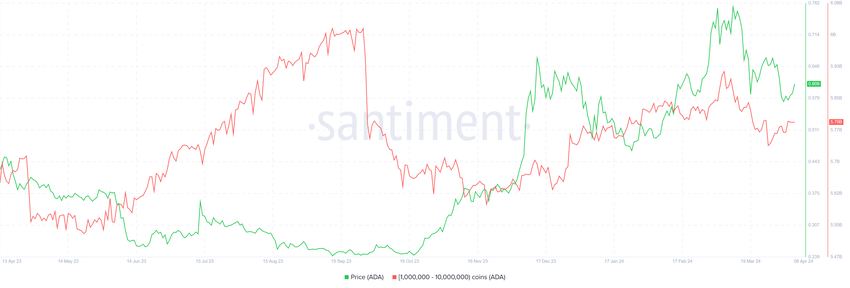 しかし、100万から1000万ADAを保有するアドレスが、3030万ドル相当の5000万ADA近くを蓄積した10日前に、これは変化した。これにより、彼らの保有総額は57億9000万ADAに達した。