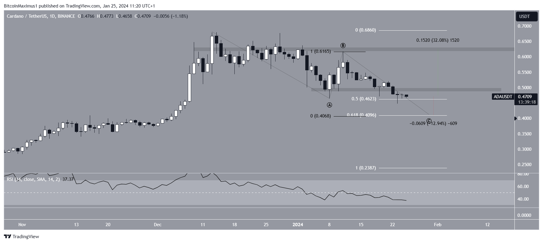 A:C波を1:1の比率にすると、安値は0.41ドルとなり、0.618フィブ・リトレースメントのサポートレベル(白)と一致する。この水準に到達するには、現在価格から13%のADA減少が必要です。日足RSIの低下もこのセンチメントを裏付けている。