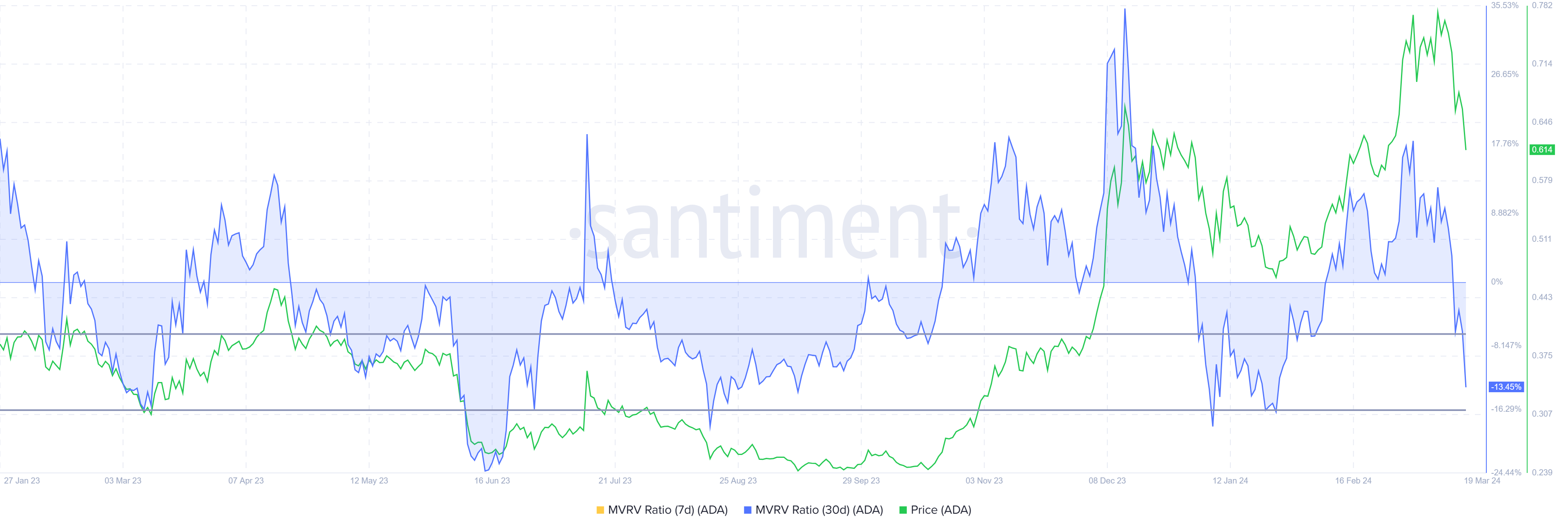 予想が弱気である一方、カルダノの価格ドローダウンは、むしろ蓄積に最適な環境を作り出している。市場価値対実現価値(MVRV)レシオによると、ADAはチャンスゾーンにある。
