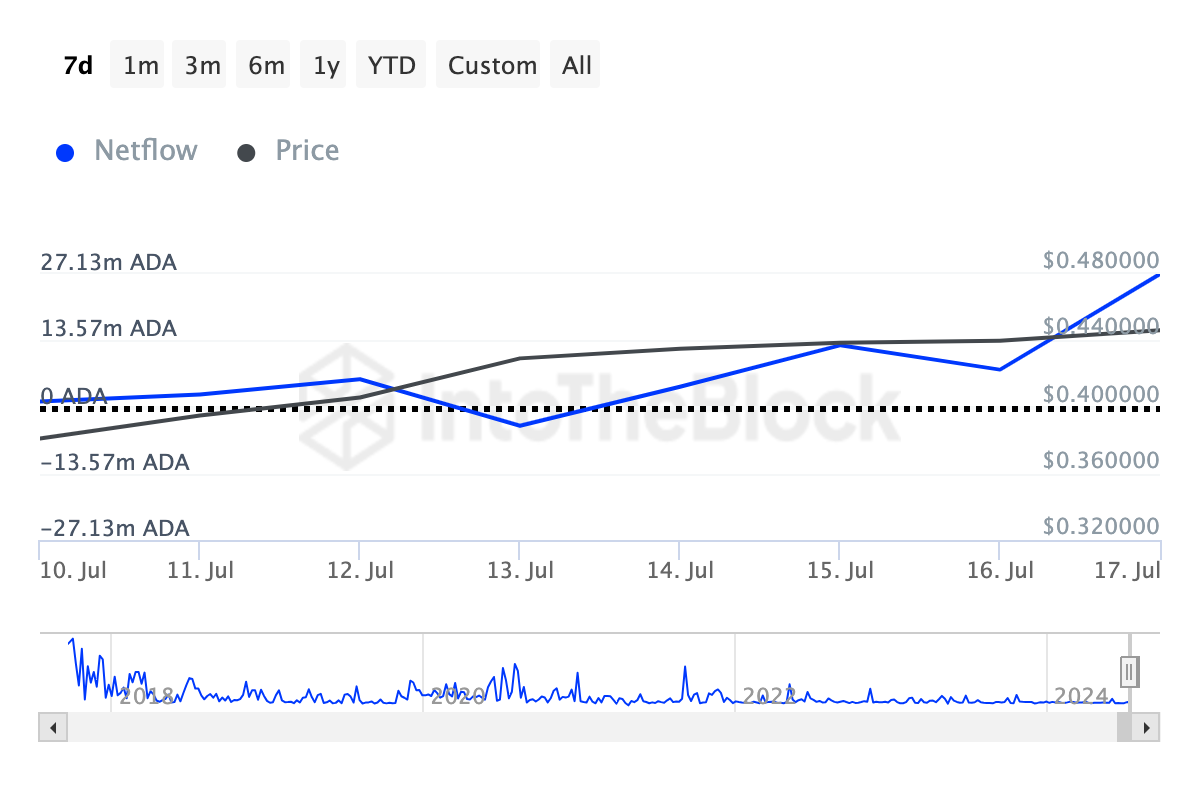 IntoTheBlockのデータによると、カルダノの場合、大口保有者のネットフローは同期間に961.07%という驚異的な増加を示し、ADAの価格は14%急騰した。