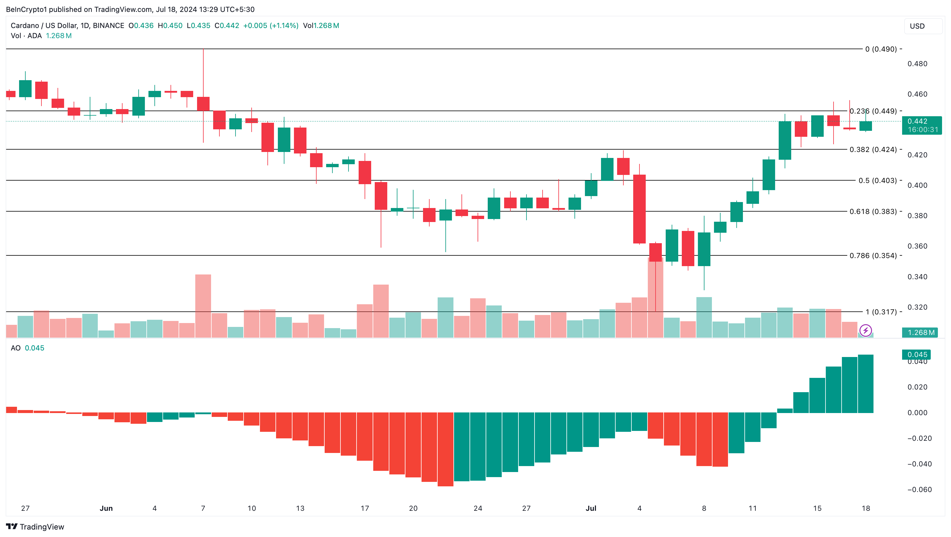モメンタムが引き続き上昇する場合、ADAの価格の次のターゲットは、フィボナッチリ・トレースメント・インディケータが示すように、0.49ドル前後になる。